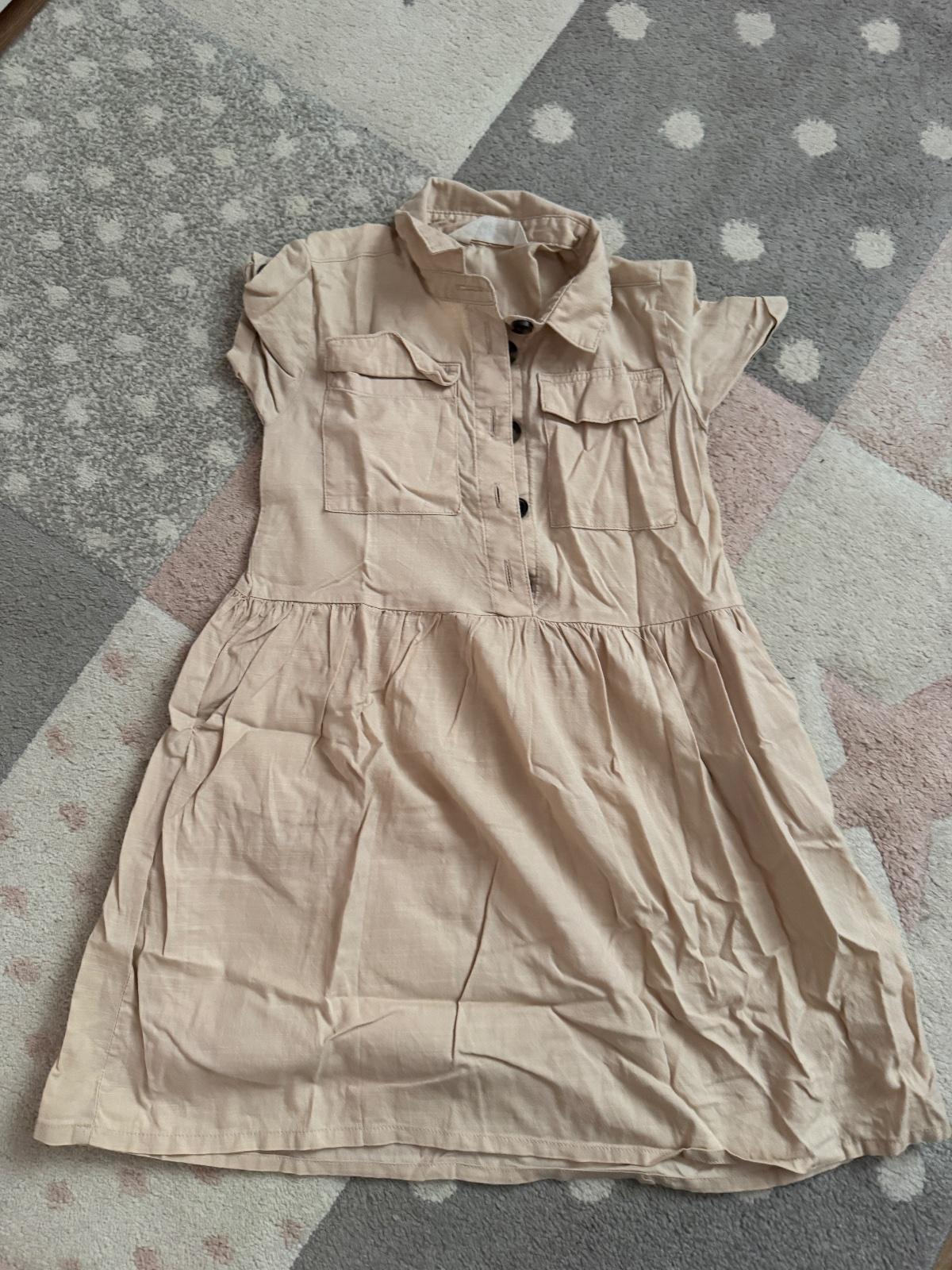 Krásne šatôčky béžovej farby s čiernymi srdiečkami s volánikovými rukávmi v super stave. Môžu sadnúť aj ako 122.