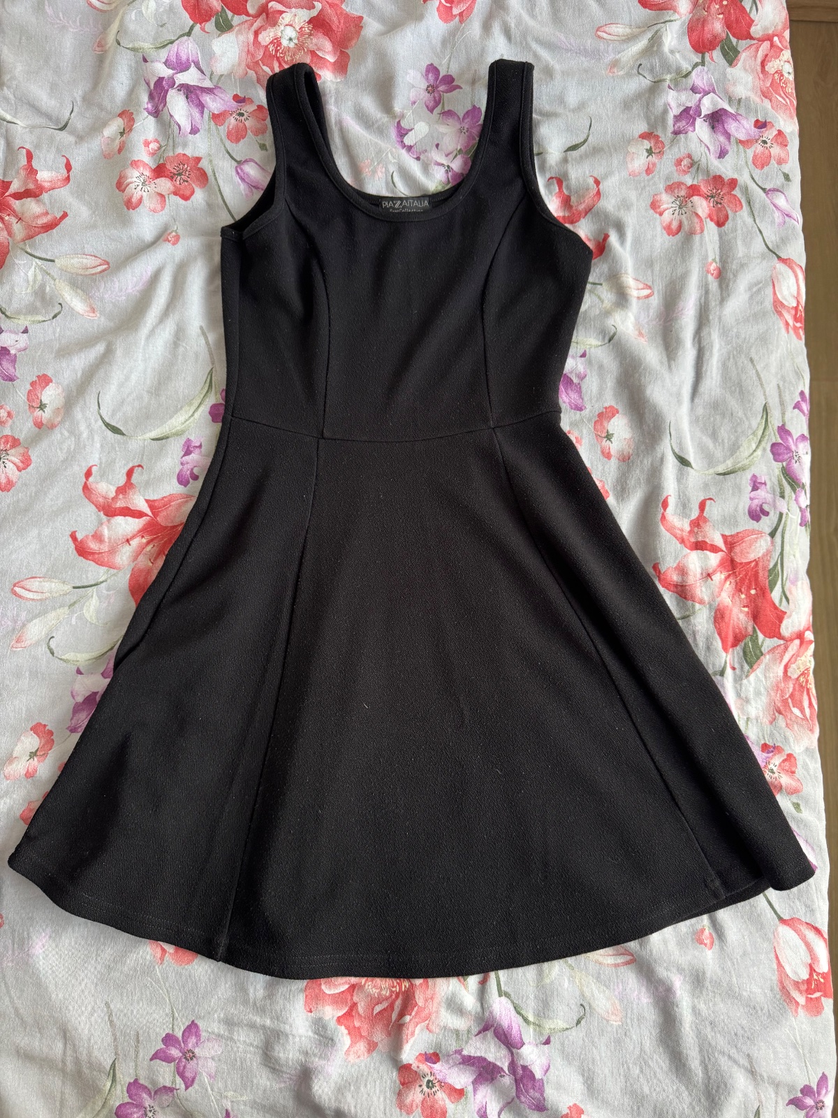 Krátke čierne šaty, trošku hrubší materiál. Veľkosť neuvedená, ale sedí na 36/38. Materiál je prispôsobivý. Rozmery: dĺžka 88 cm, pod pazuchami 39 cm, pás 34 cm