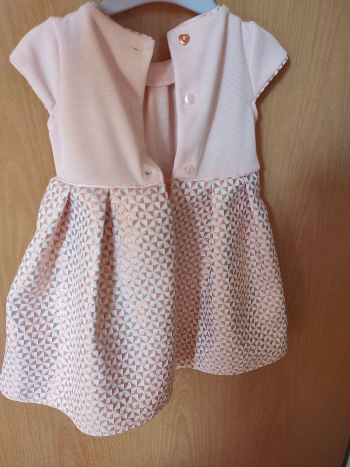 Krásne šaty .pekná jemná ružová so zlatými aplikáciami pekne sa lesknu na fotke nieje až tak vidno veľkosť 80 kludne aj menšia 86 povedala by som.mali sme to oblečené raz asi hodinu.pri záujme popr...