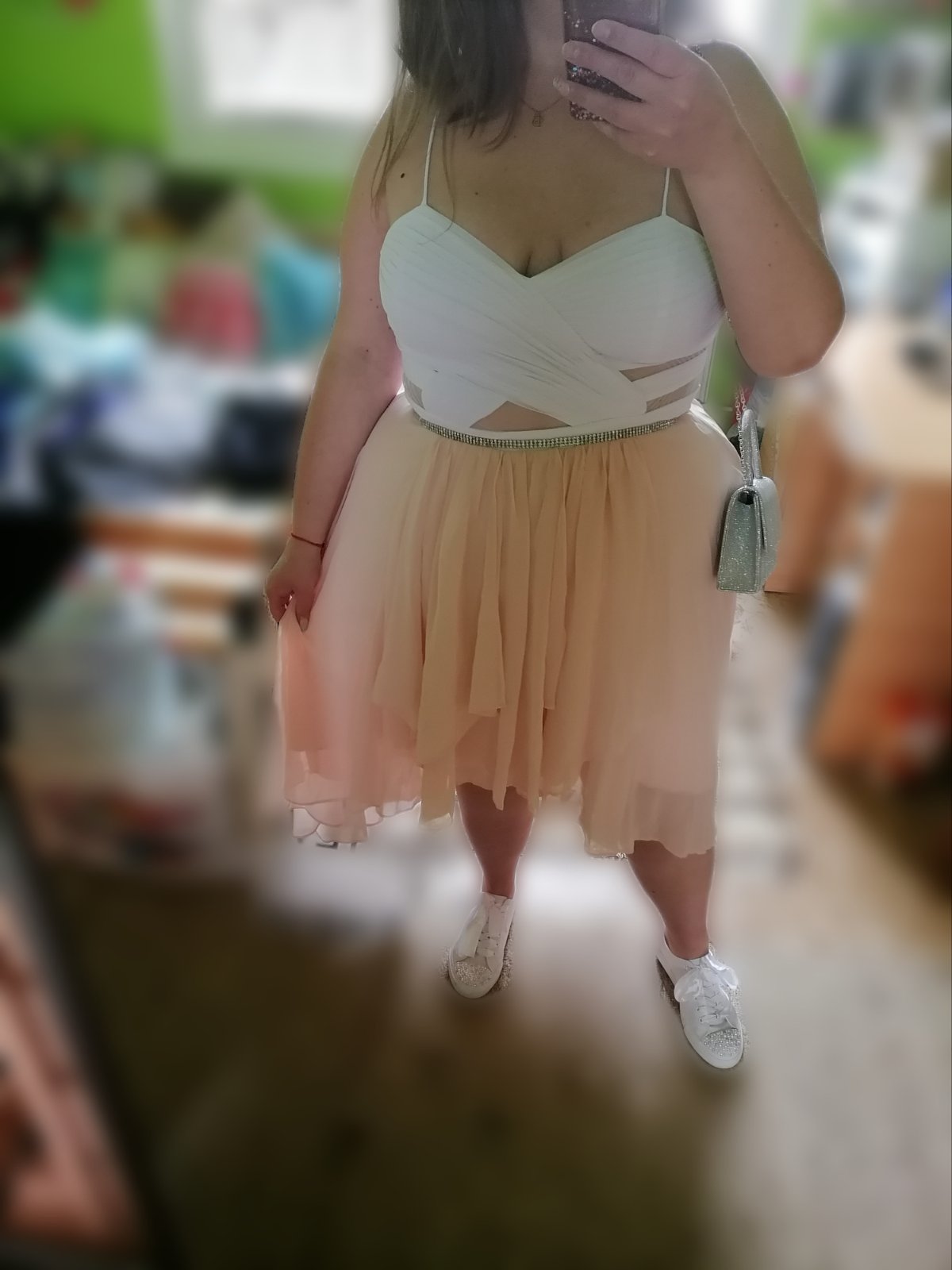Asymetrické spoločenské šaty, ktoré sedia na veľkosť 48, no každopádne sa treba riadiť rozmermi. Šaty som mala len raz na sebe ale po vypraní som na nich všimla drobné nedokonalosti, viď posledné 2-fotky. Pri bežnom nosení to nie je vôbec vidieť ale je to tam tak upozorňujem nato.