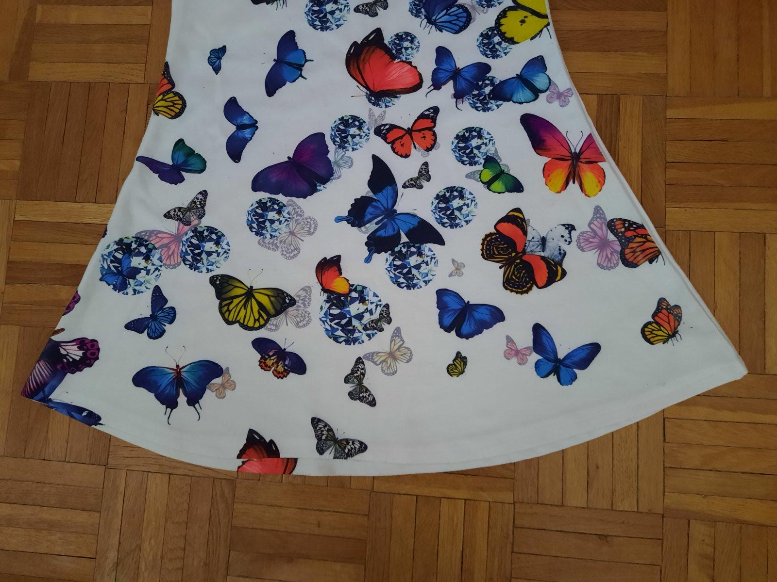 Krásne biele elastické šaty, A-čkový strih, vpredu s motýľmi. Výborný stav.