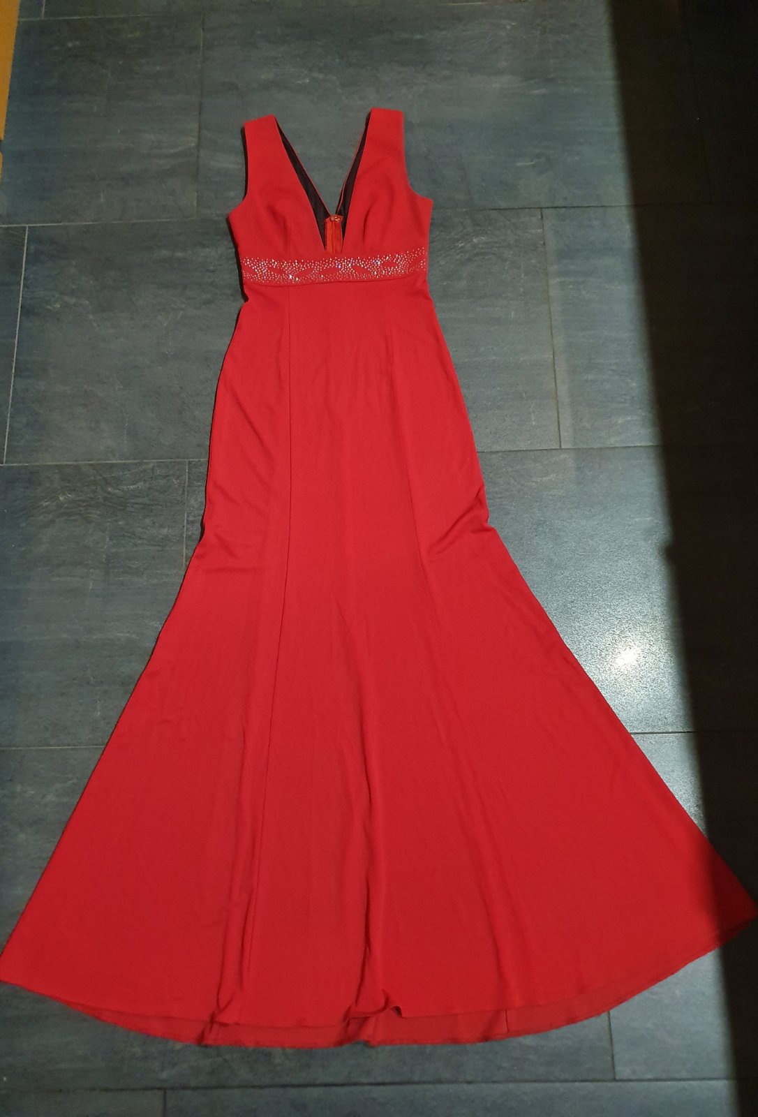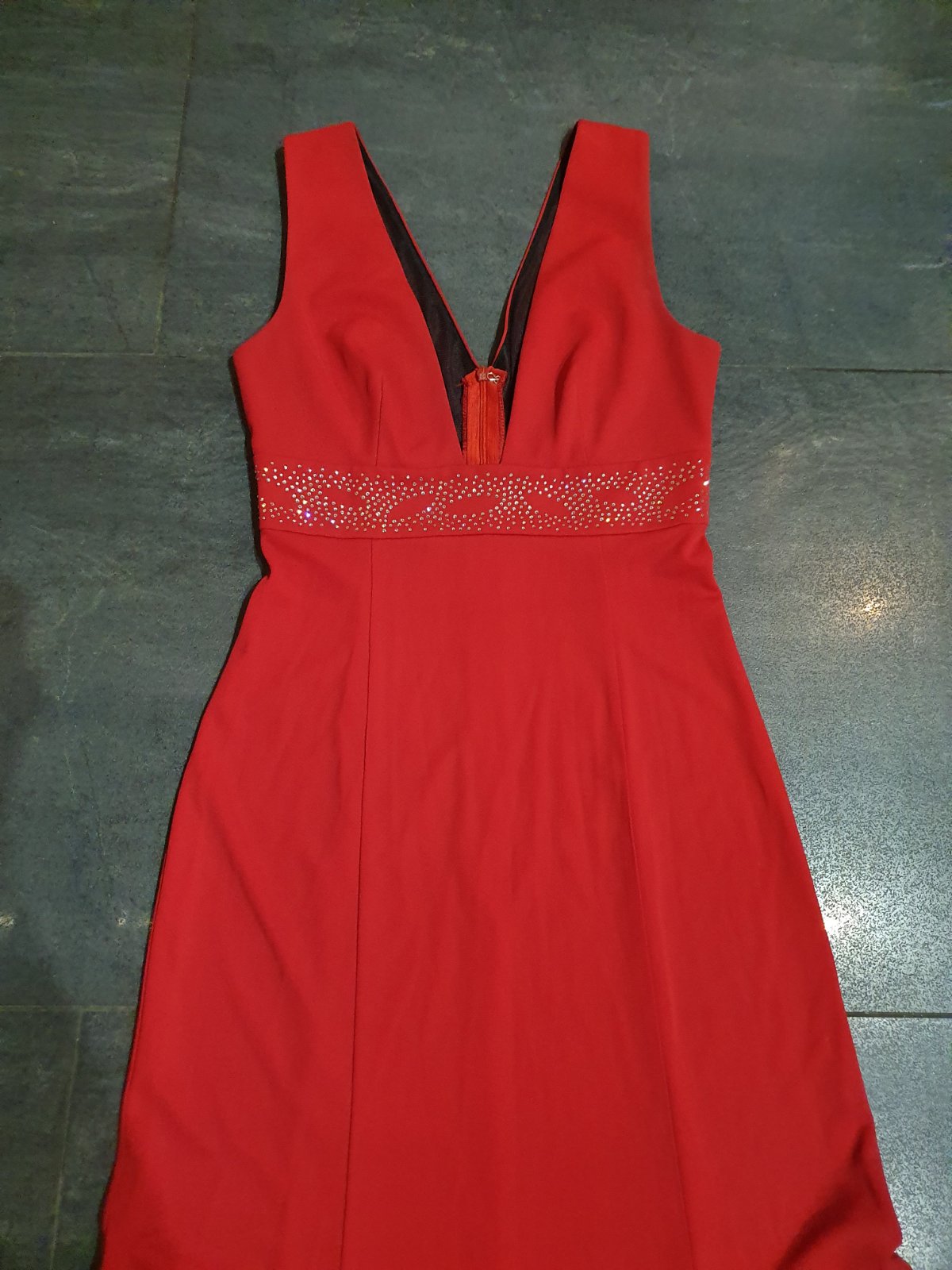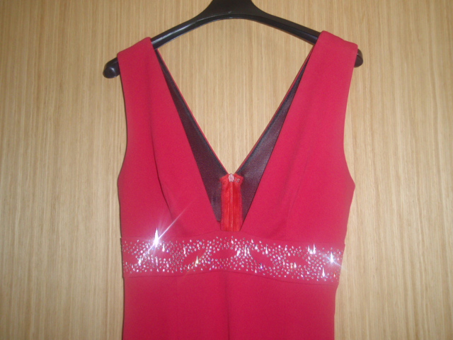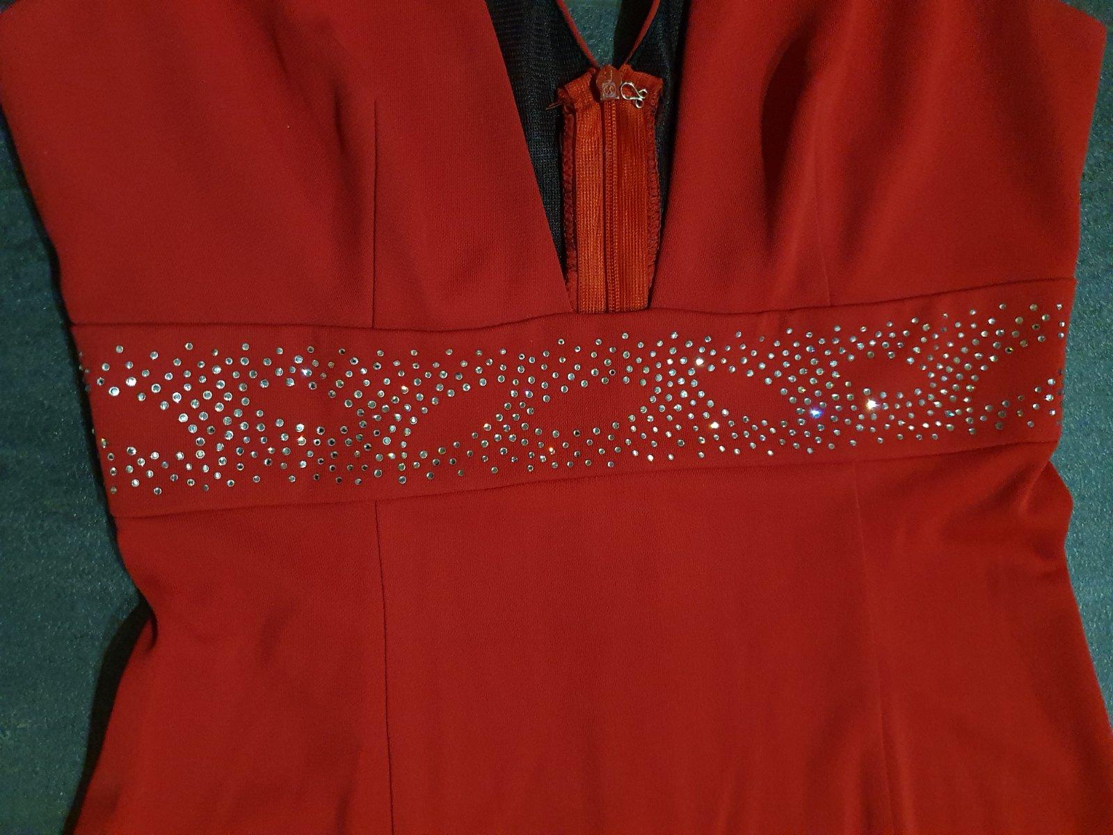 Nádherné, pár krát oblečené. Hlboký výstrih, pod prsiami kamienky, úzky strih so širšou sukňou od polovice stehien...na chrbáte zips...
