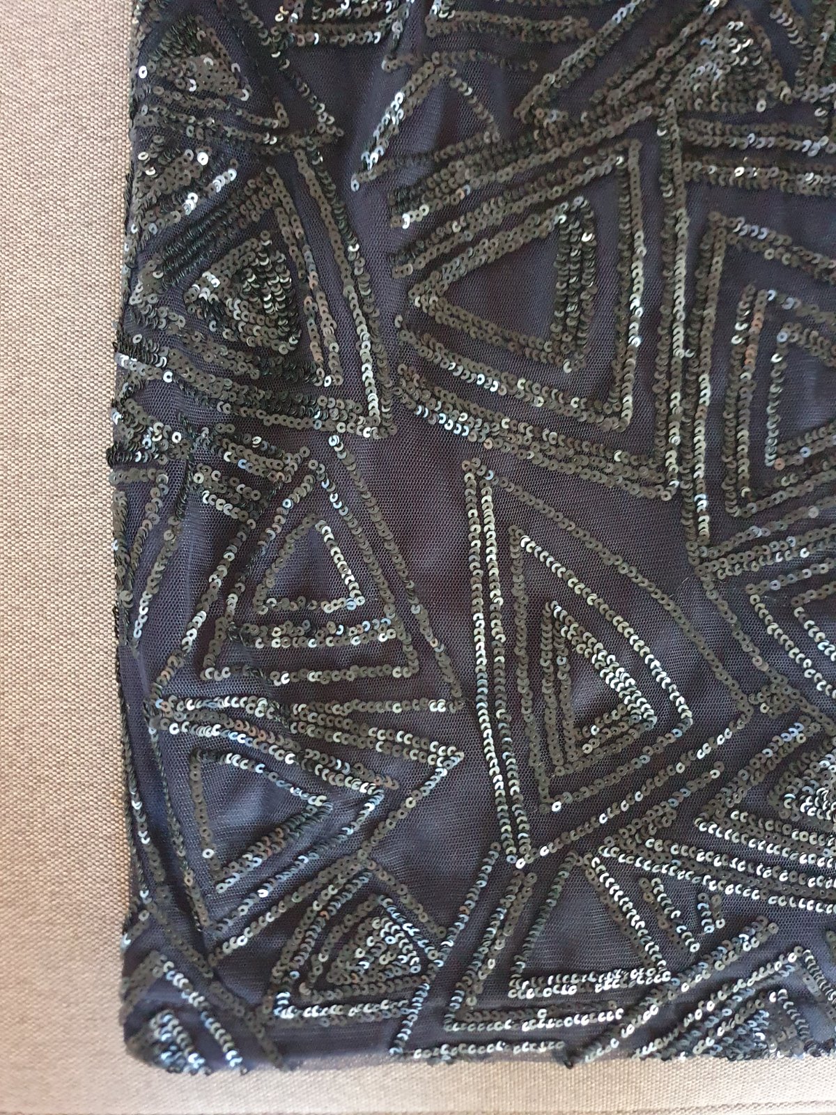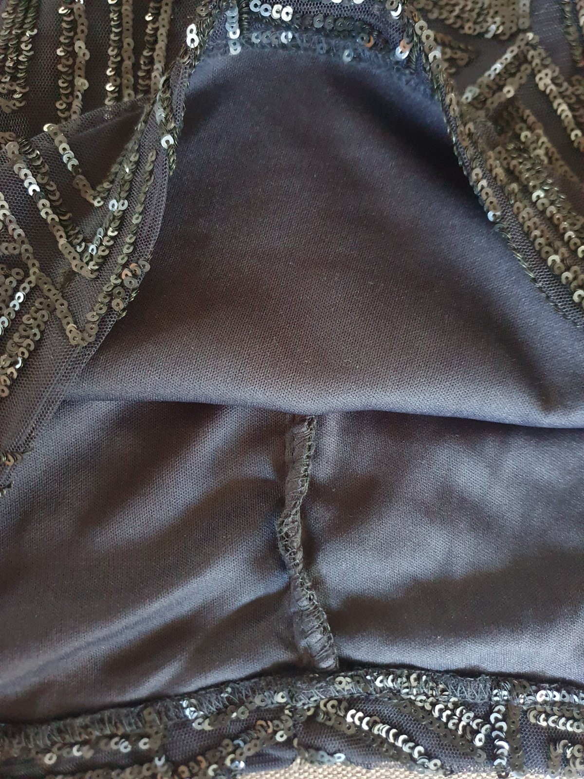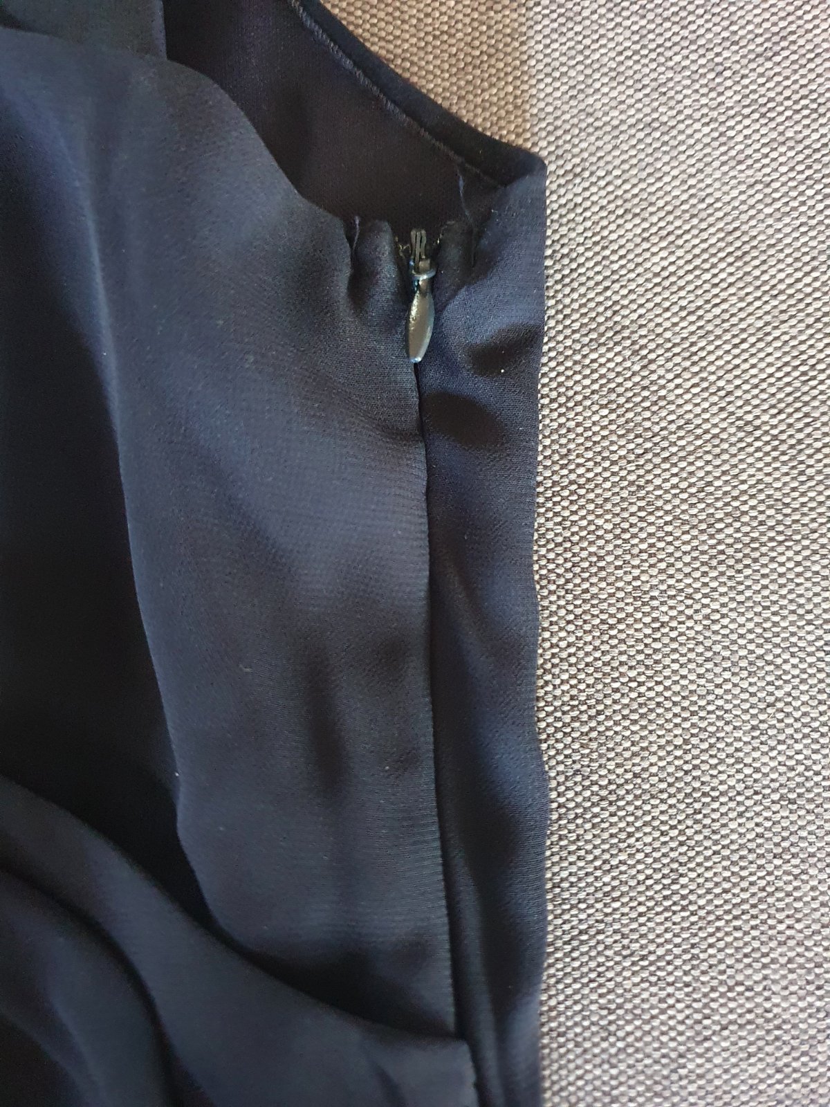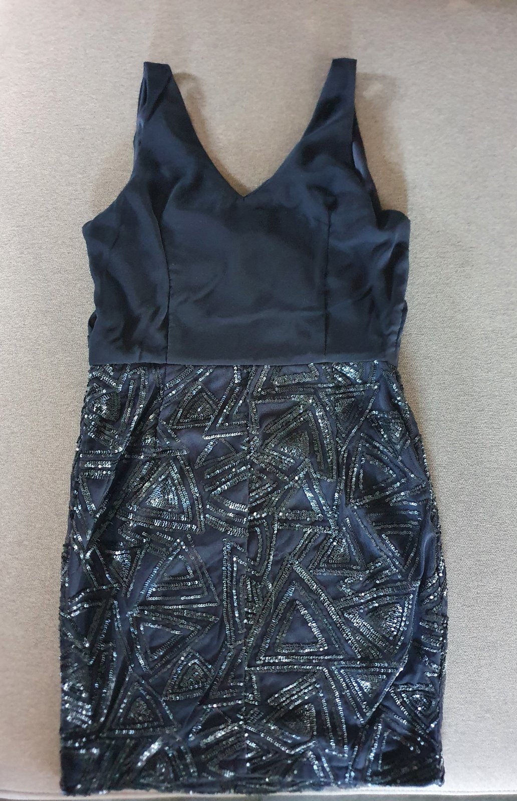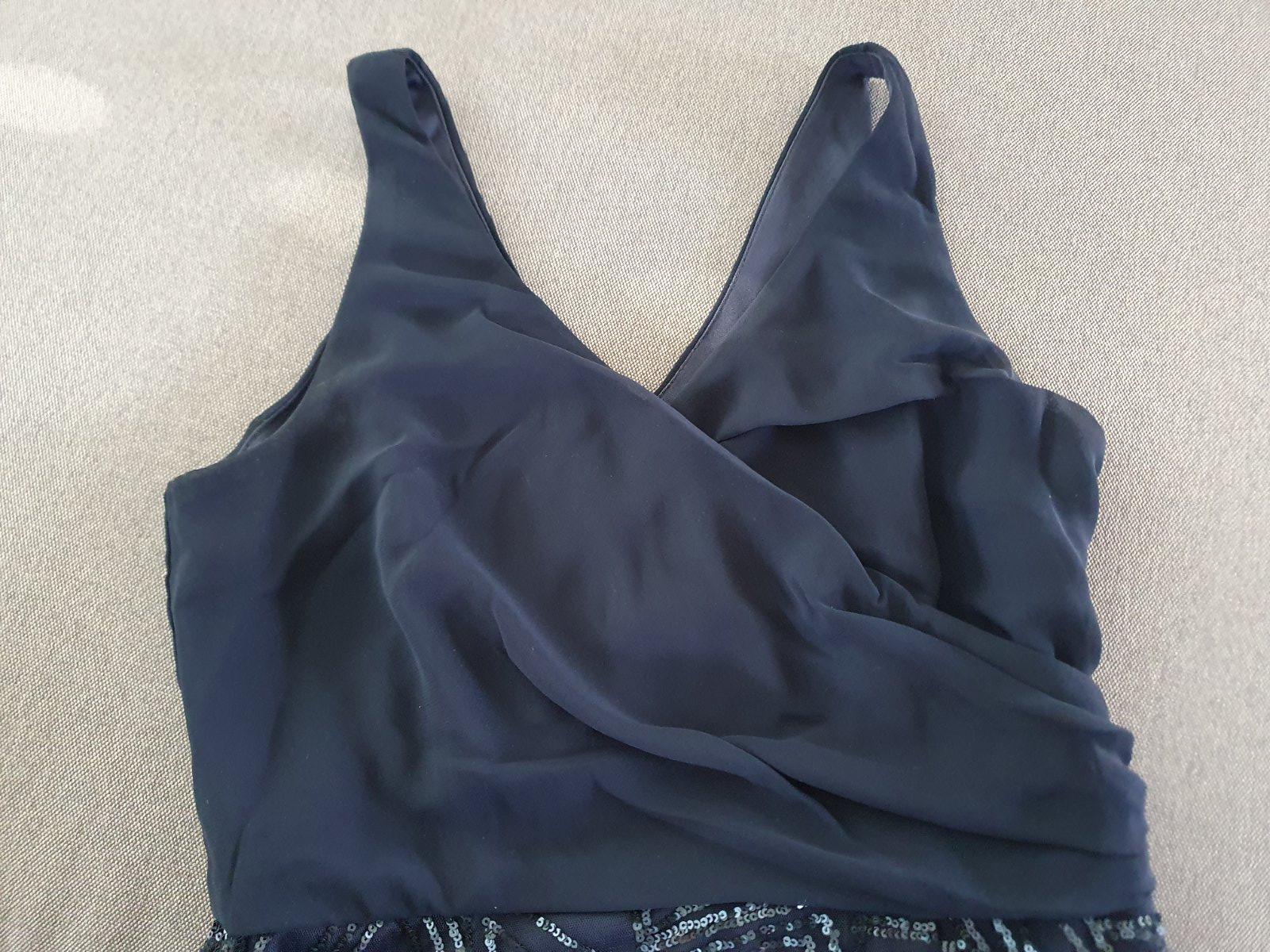 Top stav, 1x oblečené na oslave. Vrch šifónový podšitý. Sukňa podšitá. Na boku zips. Šp paz cca 41, pás 37, dĺžka s ramienkom 85. Zn. AX Paris