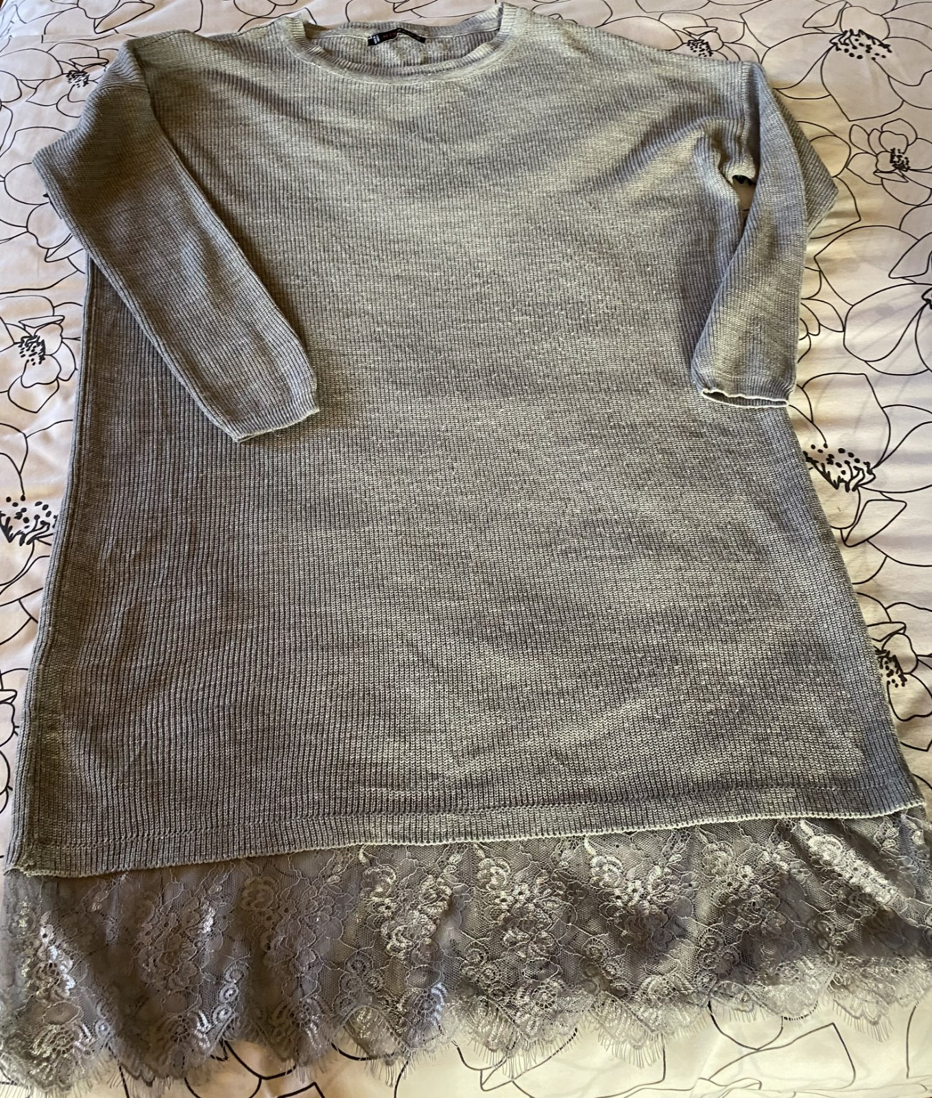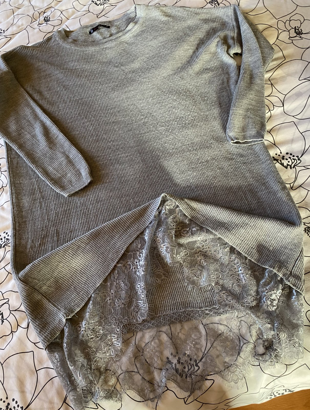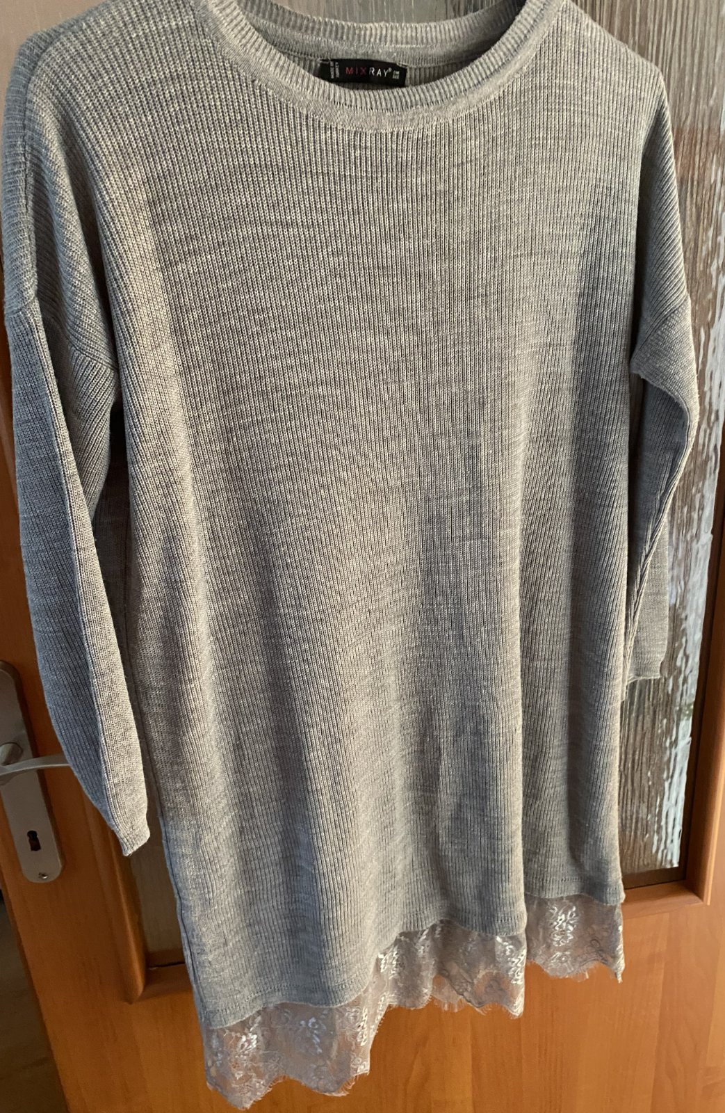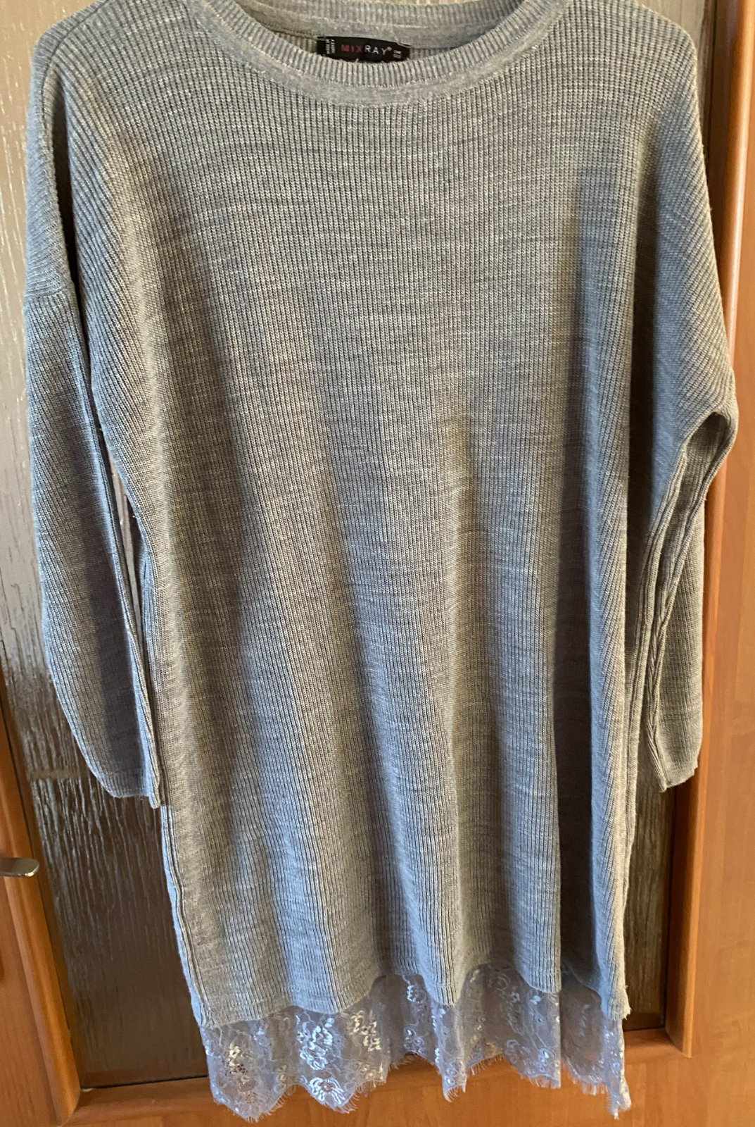Pleteninové rebrované šaty s čipkou MIX RAY, písaná v. one size, dávam XXL - premerajte, v spodnej časti ukončené veľmi peknou čipkou, pletenina je pevnejšia, nie tenká, príjemný materiál na nosenie, acryl, pekná šedá farba - melír, raz oblečené, v top stave. Miery merané v kľude, sú pružné, všade dosť povolia: šírka v podpazuší: 58cmx2, dĺžka od krku dolu: 76cm (pletenina) + 12cm čipka, rukáv od krku: 63cm.