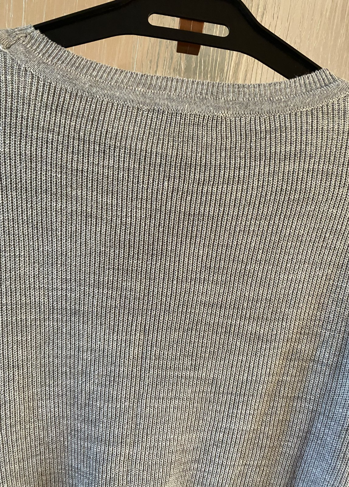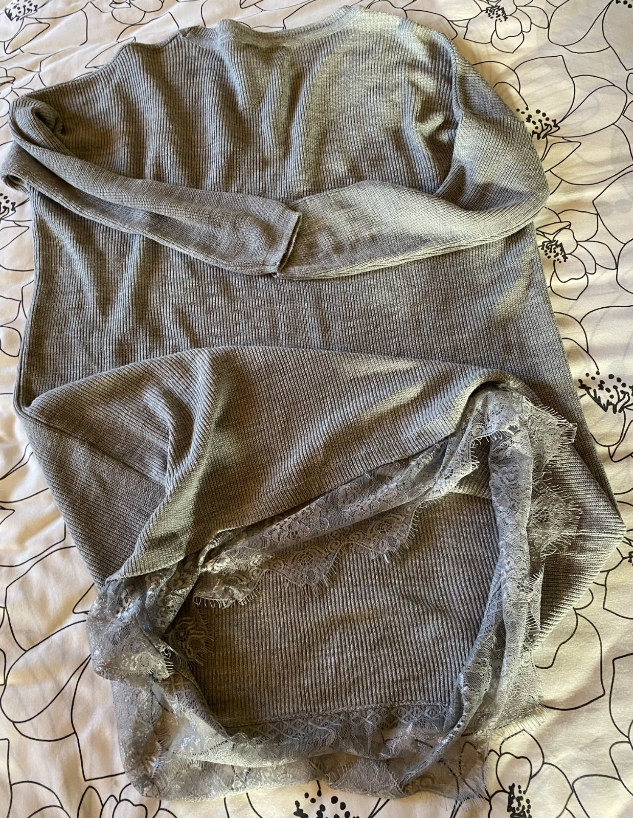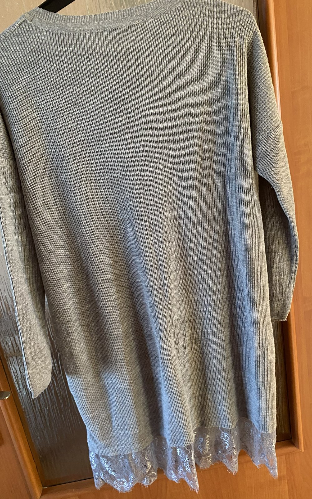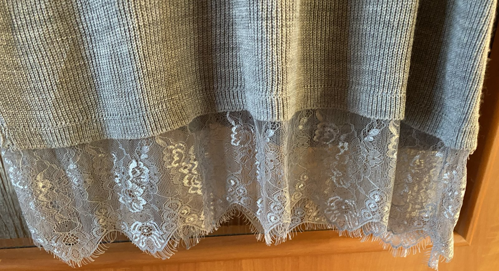 Pleteninové rebrované šaty s čipkou MIX RAY, písaná v. one size, dávam XXL - premerajte, v spodnej časti ukončené veľmi peknou čipkou, pletenina je pevnejšia, nie tenká, príjemný materiál na nosenie, acryl, pekná šedá farba - melír, raz oblečené, v top stave. Miery merané v kľude, sú pružné, všade dosť povolia: šírka v podpazuší: 58cmx2, dĺžka od krku dolu: 76cm (pletenina) + 12cm čipka, rukáv od krku: 63cm.