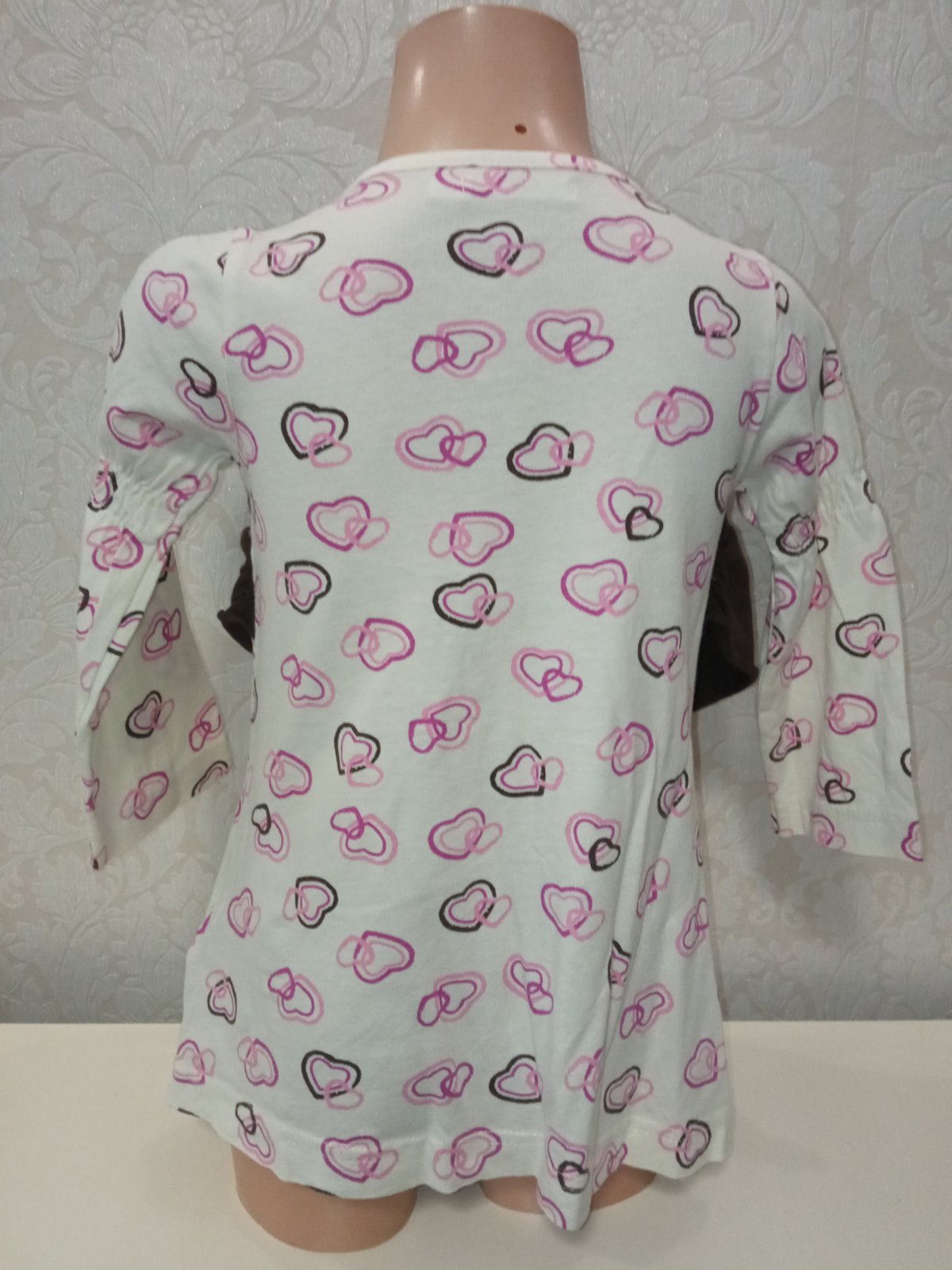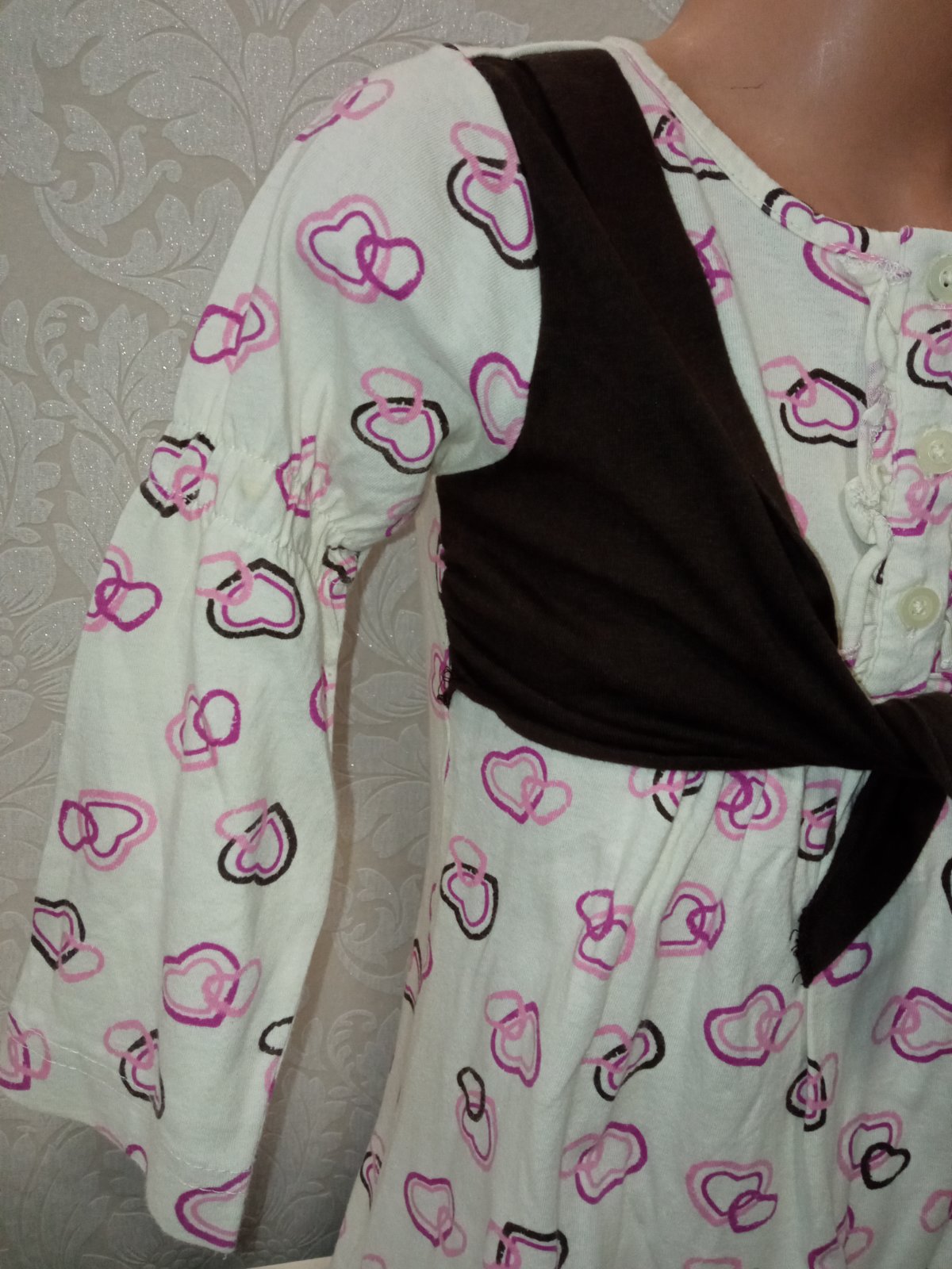 Dievčenské šaty s dlhým rukávom a srdiečkami. Prišitá vesta. Zapínanie na tri gombíky. Elastické. Tenké. Materiál:100%bavlna.
