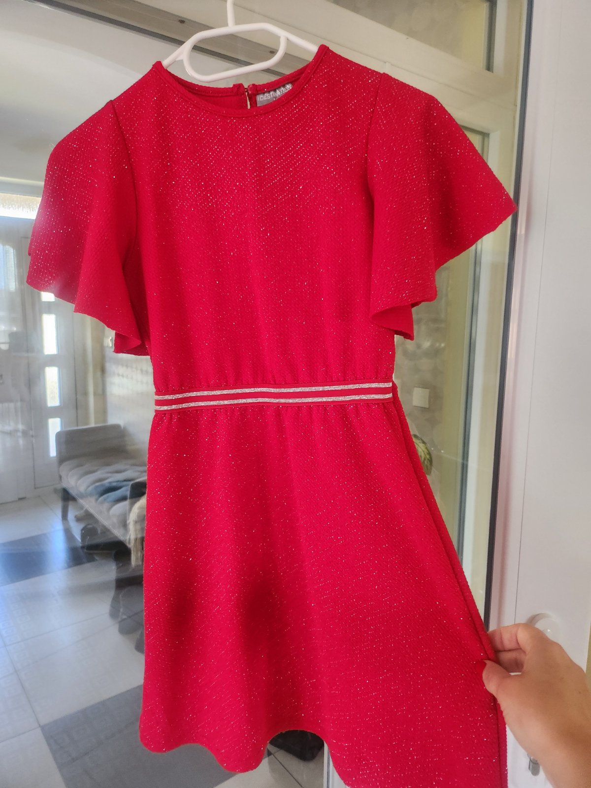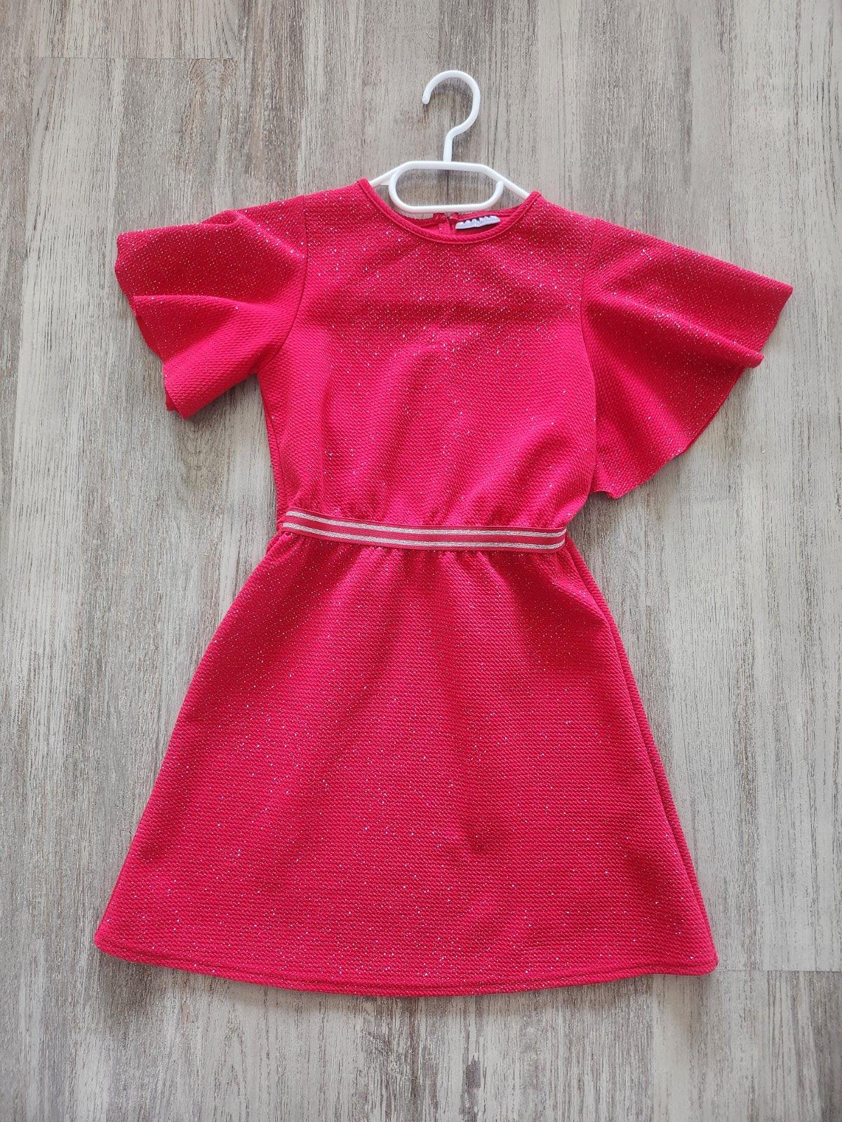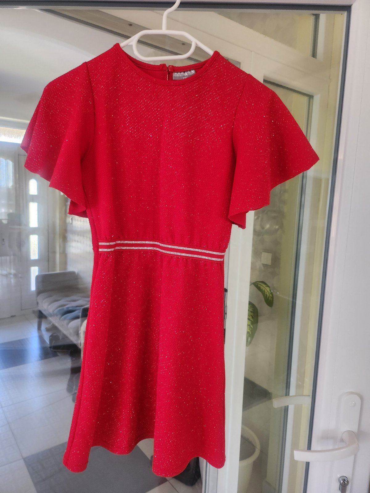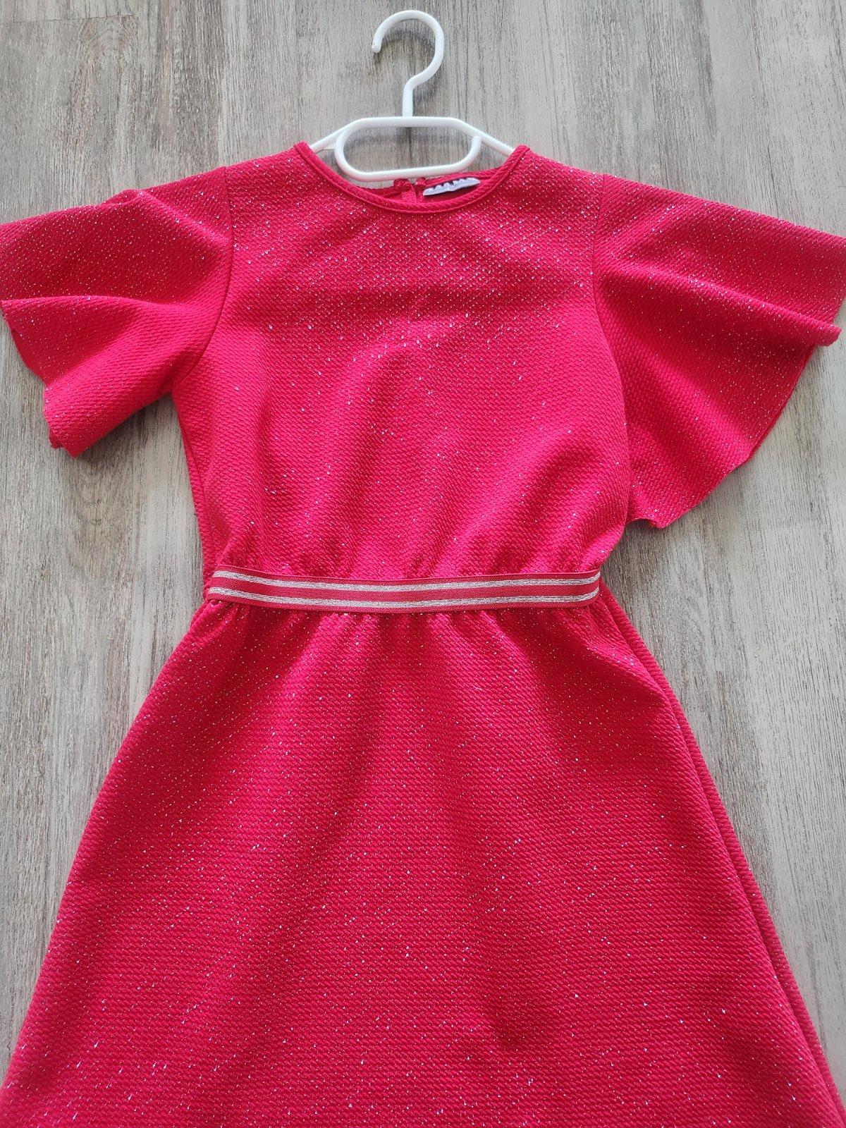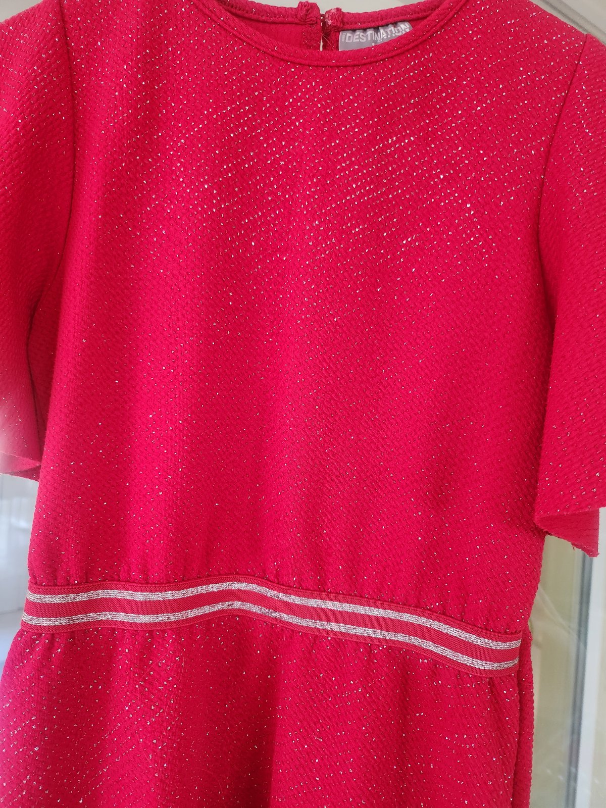 Krásne lesklé červené šaty. Pekne sa lesknu na slnku aj na svetle. V páse je gumička, pekne sa prispôsobia postave. Písaná veľkosť 146,ale sedí na 134-140.Značka Destination