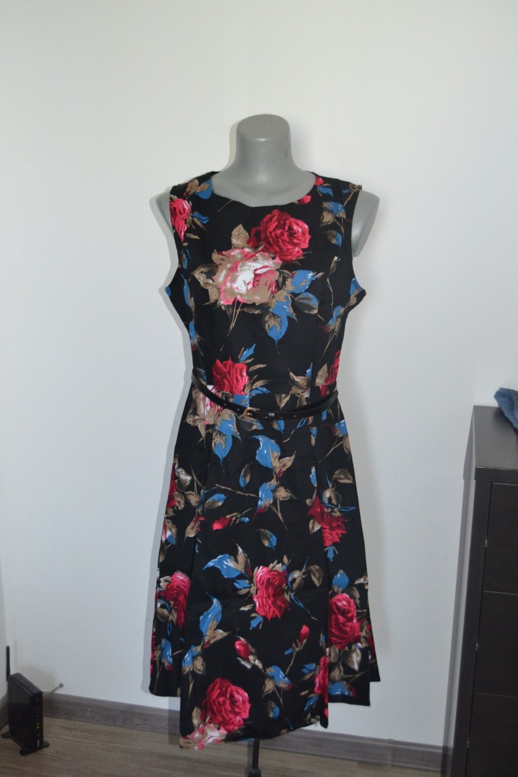SkladomDámske elegantné čierne šaty s veľkými kvetmi, mierne elastický materiál, k šatám je opasok, zapínanie vzadu na chrbte na zips, sukňa strihaná do áčka, veľkosť L, obvod cez prsia 100 cm, dĺžka 105 cm.