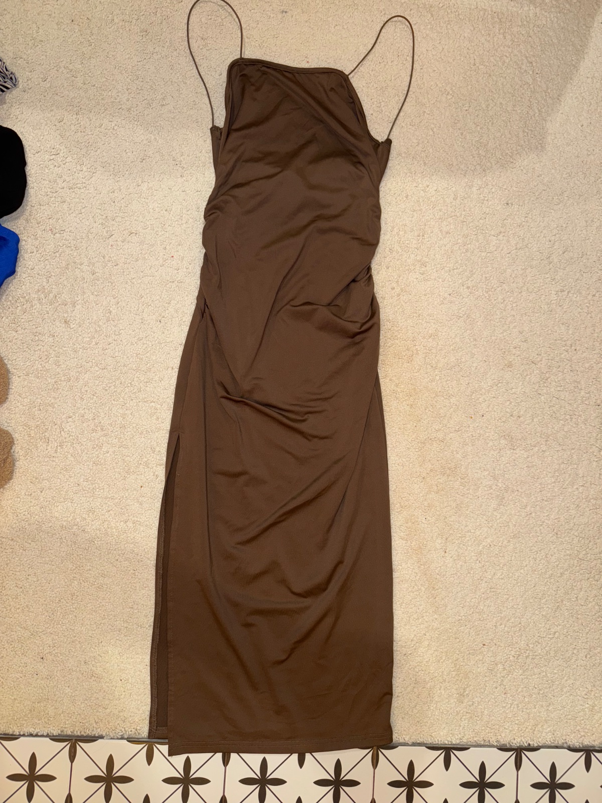 Predám krémovo hnedé šaty zn. Jones, kupované v Rakúsku, s podšívkou, bez známok nosenia, zips vzadu, material: polyster, elastan, rozmery: v prsiach: 37cm, dlžka 94cm, cena 30€ + poštovné