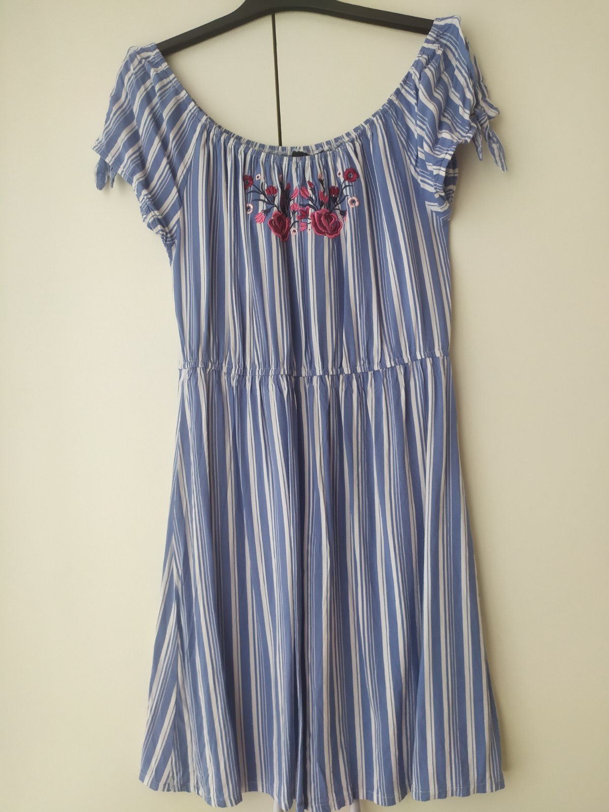 Krásne letné šaty vhodné aj na slávnostnú Výborný stav. LDĺžka 85cm, šírka v páse 35cm (guma), rukáv 14 CM.