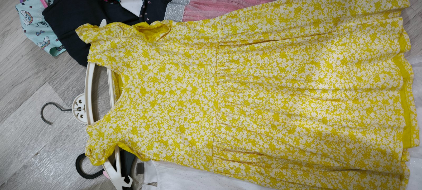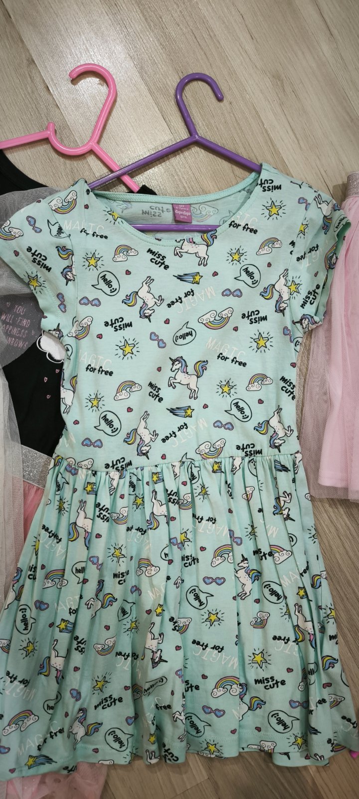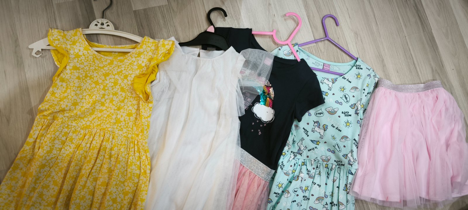 Predám 4ks letných šiat+1ks sukňa, veľmi pekný stav. Veľkosť 122. Celková dĺžka 59-61cm, sukňa meria 33cm, značky dopodopo,H&m, Pepco. Farby -žlté s bielymi kvietkami, mentolovo zelené s jednorožcami, tmavomodrý vrch s druhou a ružovou sukňou, a bledo ružová sukňa,tylová.Cena spolu.
