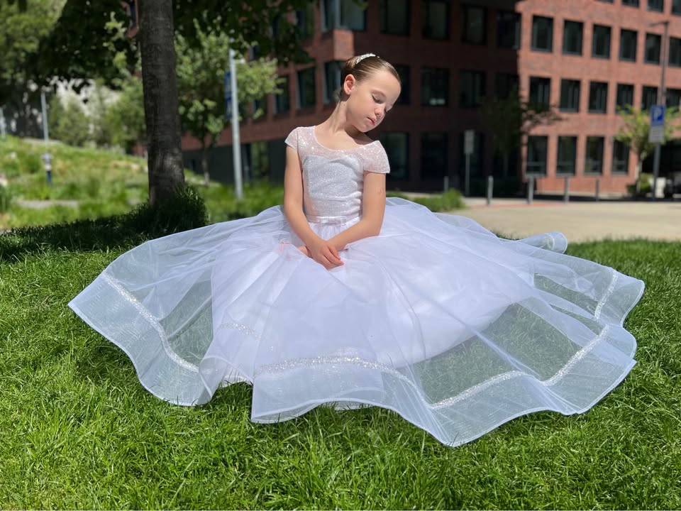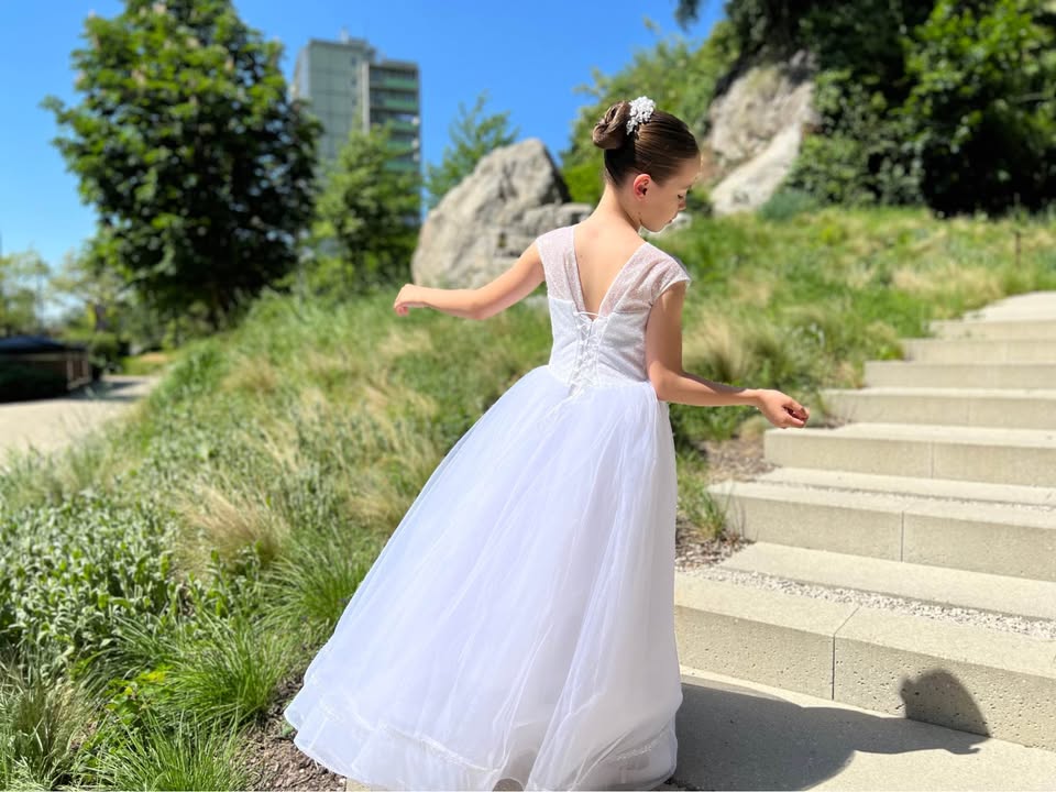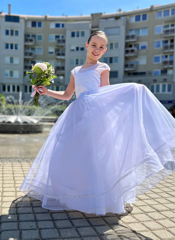 Predam nadherne dievcenske saty na 1.sv. prijimanie alebo na svadbu pre druzicku. Saty su v 100% stave. Skladaju sa zo siat, bieleho bolerka a spodnicky s obrucou, ktora zabezpeci siroku suknu. Velkostne sedi na 134-152 cm postavu. Vyhodou je snurovacka na chrbte, takze saty sa prisposobia akejkolvek postave.