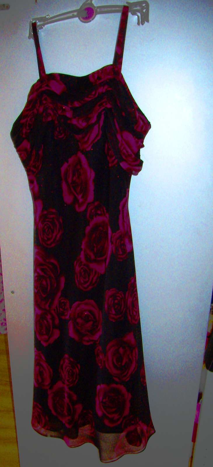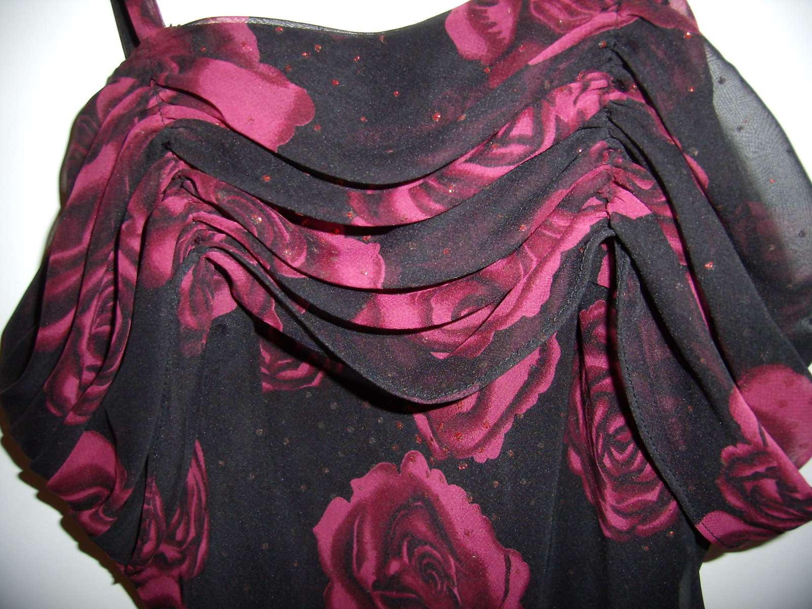 Šaty majú drobné trblietky, sú tesne pod kolená. Dĺžka 113 cm, šírka v prsiach 45 cm (x2), pás 40 cm (x2)