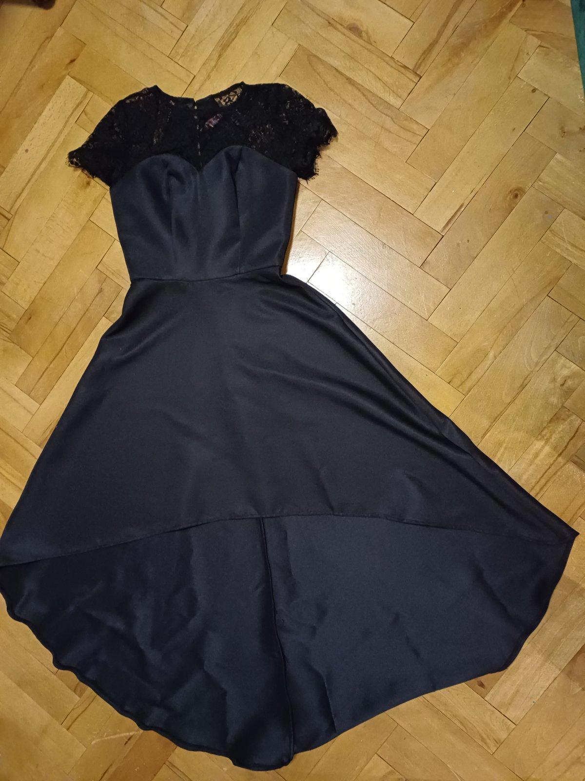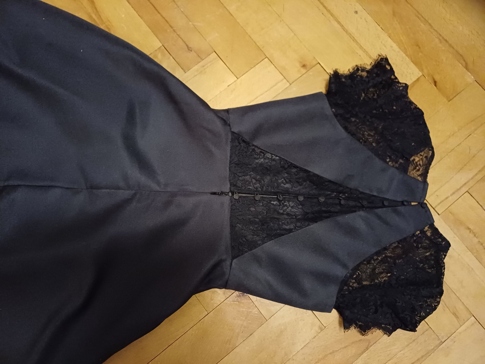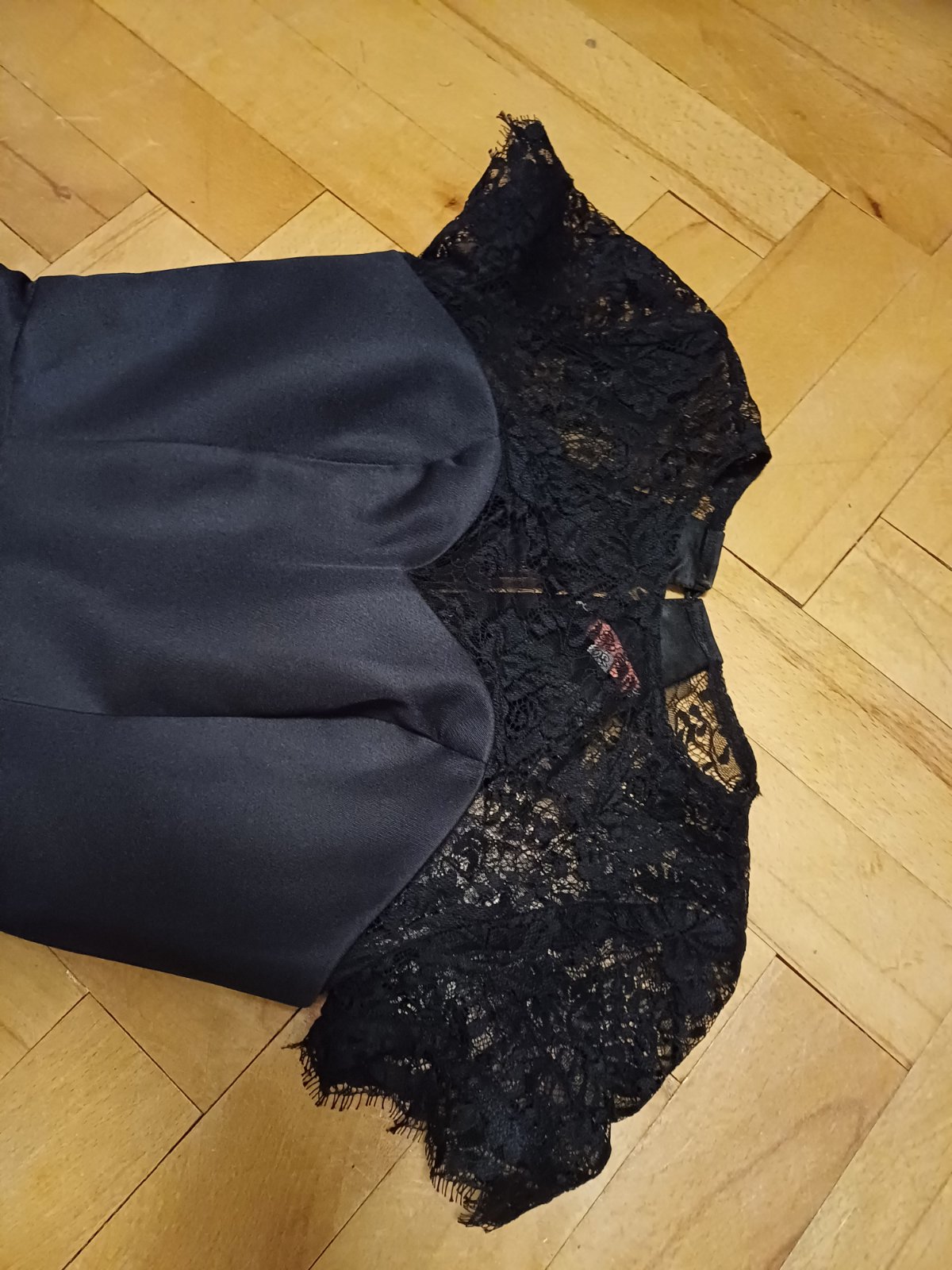 Predám tieto krásne spoločenské šaty asymetrického strihu (vpredu kúsok nad kolena vzadu dlhé).pouzité 1 krát na slávnostnú prilezitost,top stav bez zatrhnutia,dier flakov ci inych poskodeni.Úžasná kombinácia čipky a materiálu s matným odlesky, pevny material,nie sú elastické. Zadná časť riešená elegantne na gombíky a zips.velkost tuším XS/34,chce to úzky pás a útly trup.