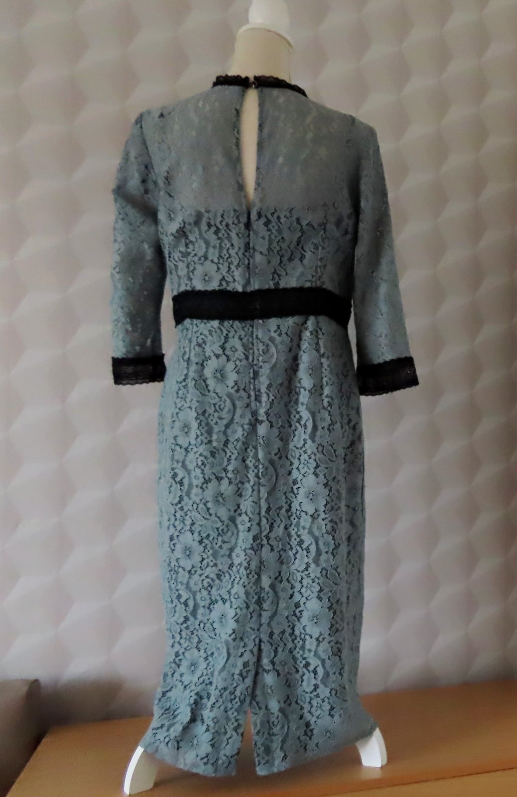 Elegantné čipkované šaty Little Mistress, veľ. L - rozmery: dlžka 107cm, pod pazuchami 2x49cm, rukáv je 3/4 dĺžky 44-29cm. Šedá elastická čipka v kombinácii s čiernou. Podšité čiernou podšívkou.