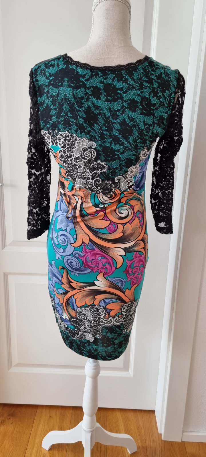 nikdy nenosené šaty, príjemný meteriál, nekrčivé, akoby krajkové priehľadné rukávy, aplikácia kamienkov. Uvedená veľkosť XL ale sedí skôr na S,M,L.