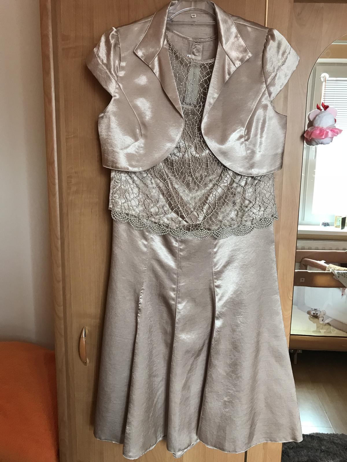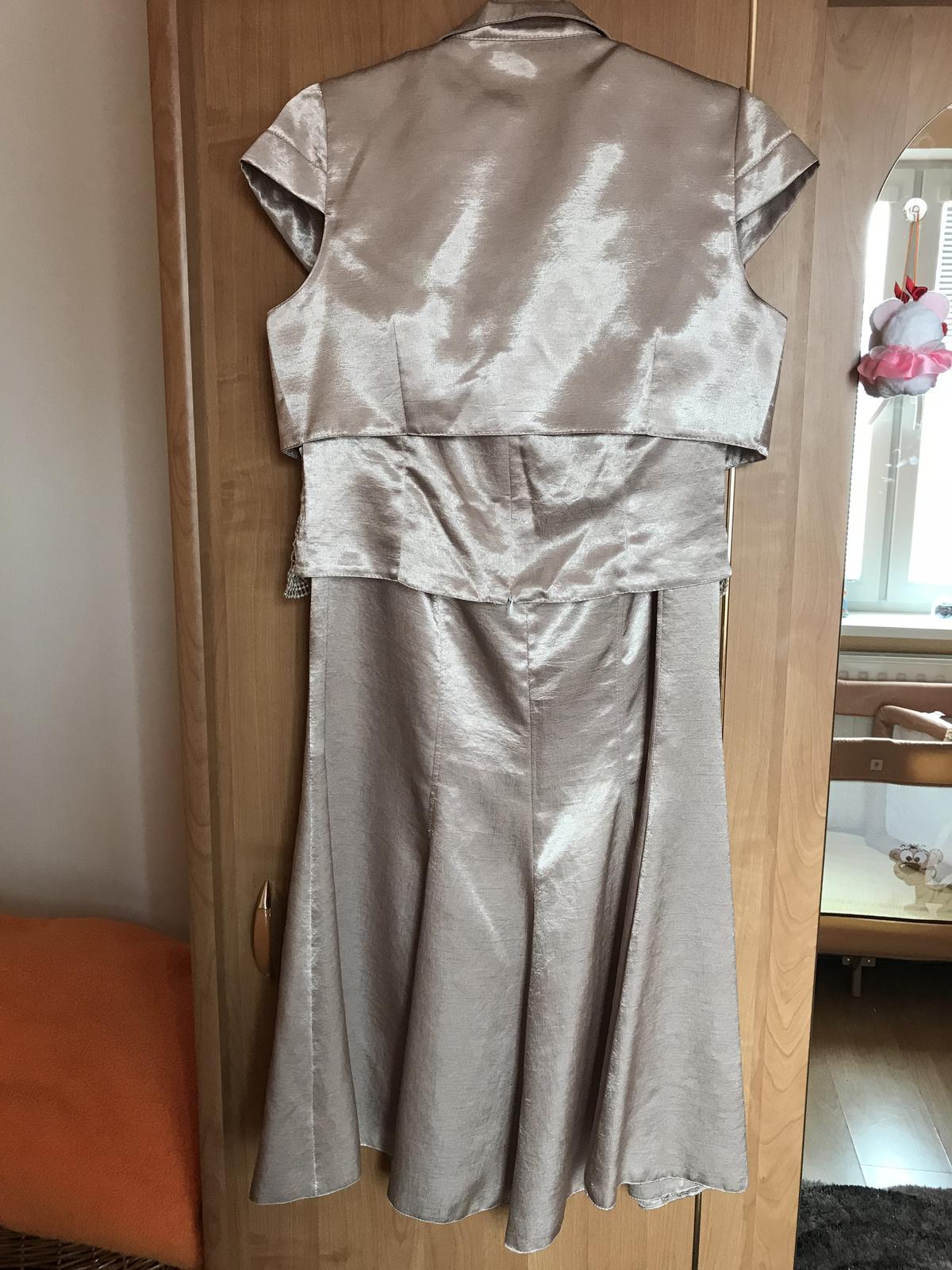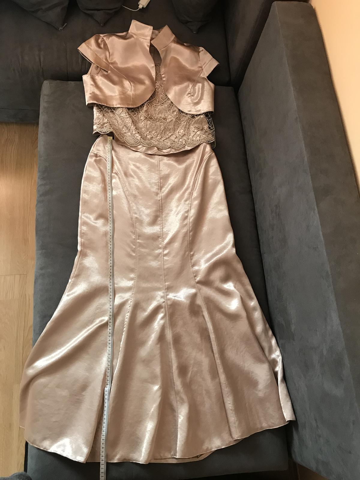 Ponúkam na predaj spoločenské saty, ktoré pozostávajú z troch dielov, a to sukňa, top a bolerko, dokopy to ale vyzerá ako saty, oblečené raz, Povodna cena 60 EUR, terajšia cena vrátane poštovného