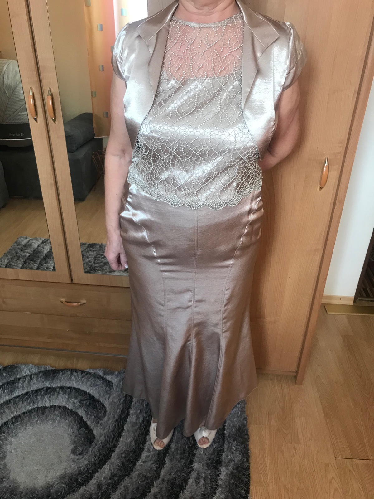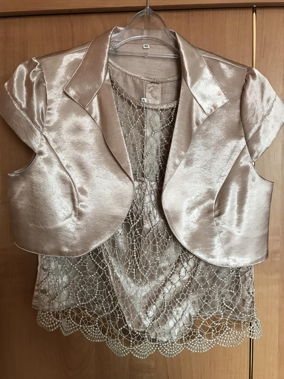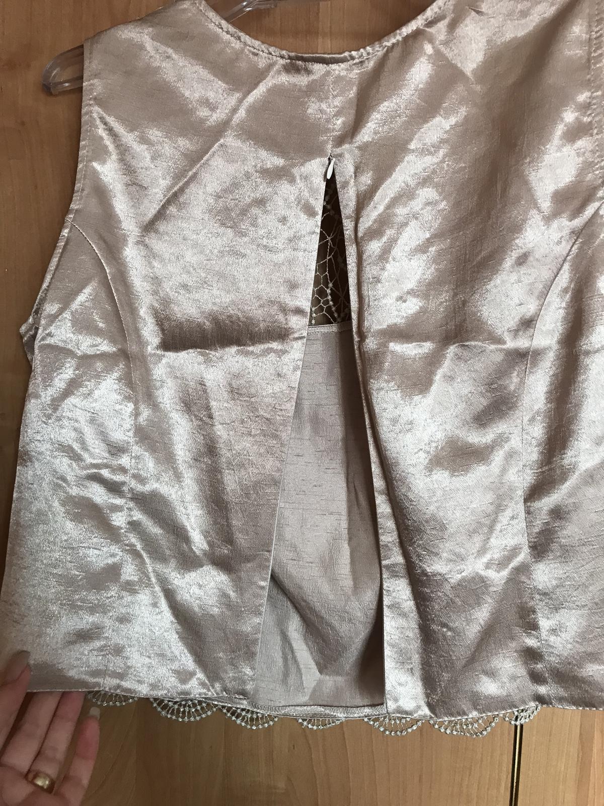 Ponúkam na predaj spoločenské saty, ktoré pozostávajú z troch dielov, a to sukňa, top a bolerko, dokopy to ale vyzerá ako saty, oblečené raz, Povodna cena 60 EUR, terajšia cena vrátane poštovného