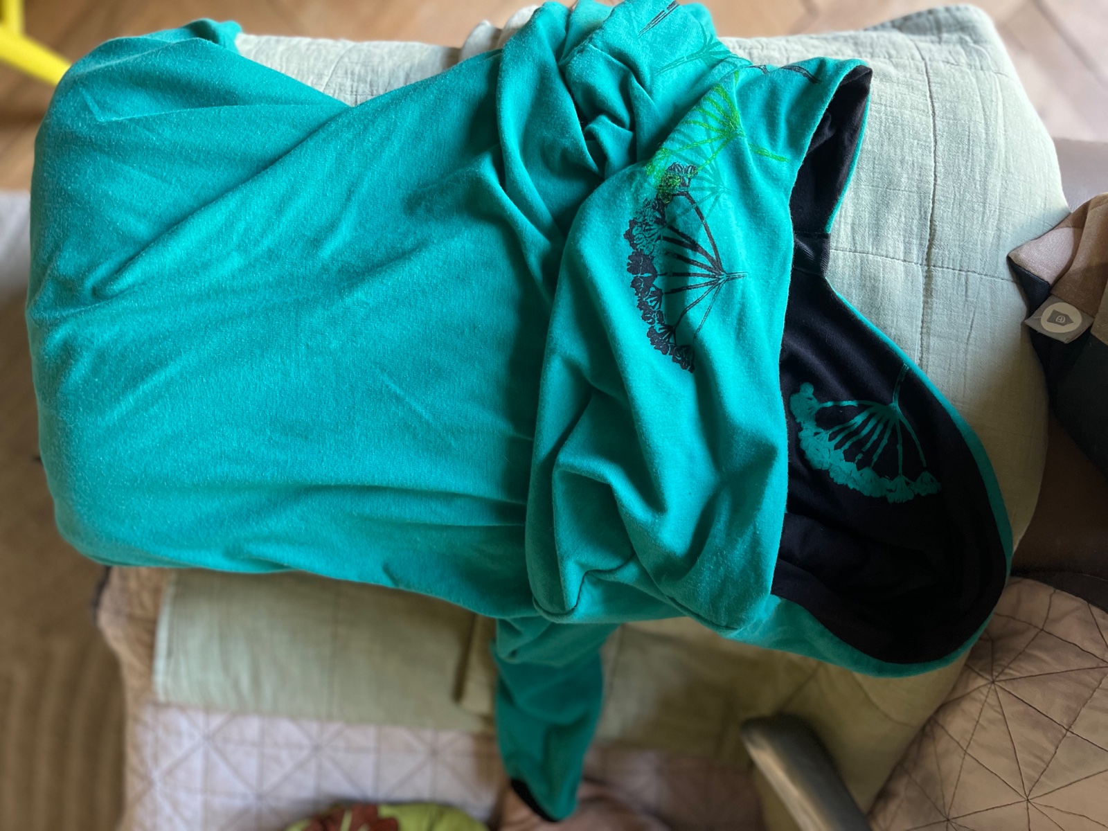 Farba je taká modrozelená tmavý tyrkiz by som povedala,podľa svetla,veľmi ľahučký materiál-úplet,v kapucke zvnútra tiež potlač.Od Ladavy,k cene pošt.