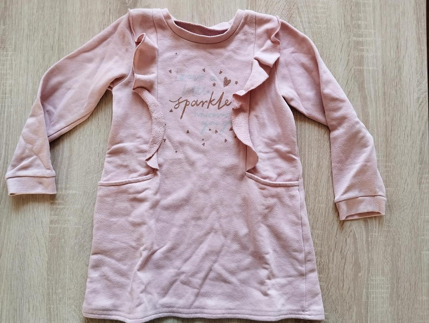 Púdrovo ružové teplákové šatičky. MaJú aj vrecká. Nosený stav, majú minižmolky. Veľkosť odhadujem, na štítku nevidno, premeriam.