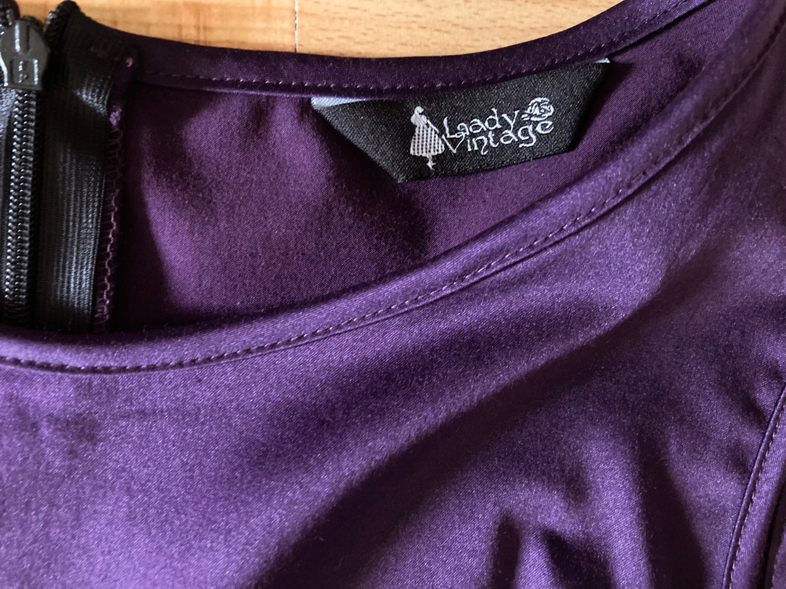Koktejlové šaty v štýle 50. rokov zn. Lady V London, široká sukňa do polovice lýtok, mierne lodičkový výstrih, čierny úzky opasok, bez rukávov.