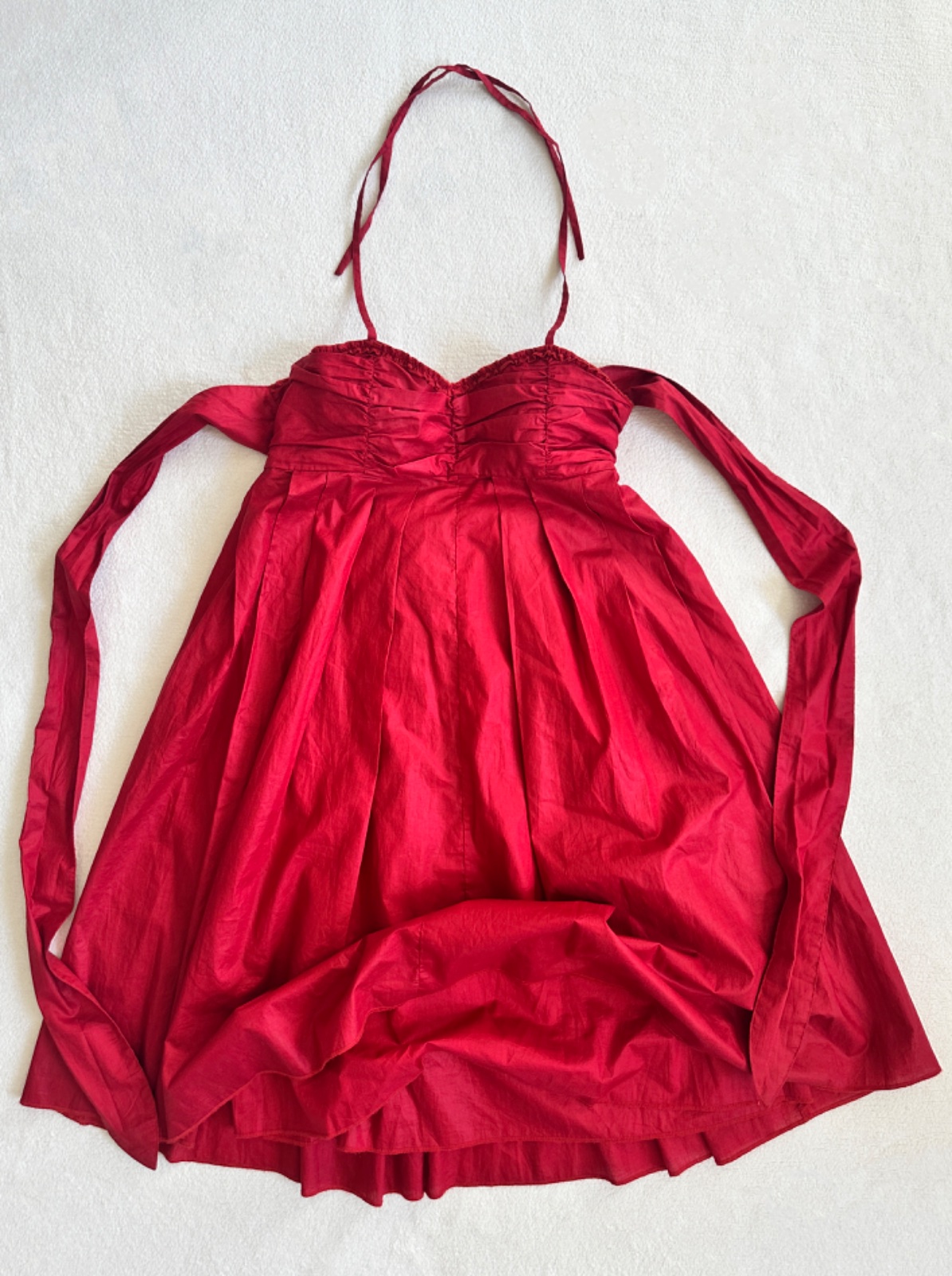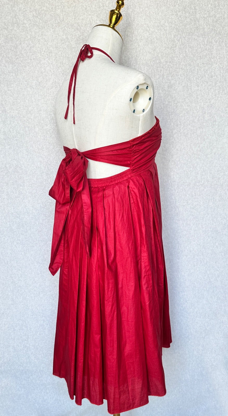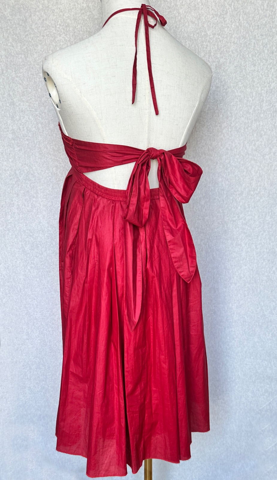Jedinečné šaty od portugalského módneho návrhára Adolfo Domingues v sýtej tmavej červenej farbe. Látka má krásny lesk, pôsobí ako navoskovaná, ale je ultra ľahučká, vzdušná. Sú vhodné aj na príležitosť. Šité sú z dvoch vrstiev látky. Dajú sa pekne prispôsobiť na postavu - vrch sa uväzuje okolo krku na šnúrku (je tak možné nastaviť výšku, polohu) a vrchný diel sa uväzuje vzadu mašľou na chrbte - dá sa utiahnuť podľa potreby. V páse je pružná gumička.