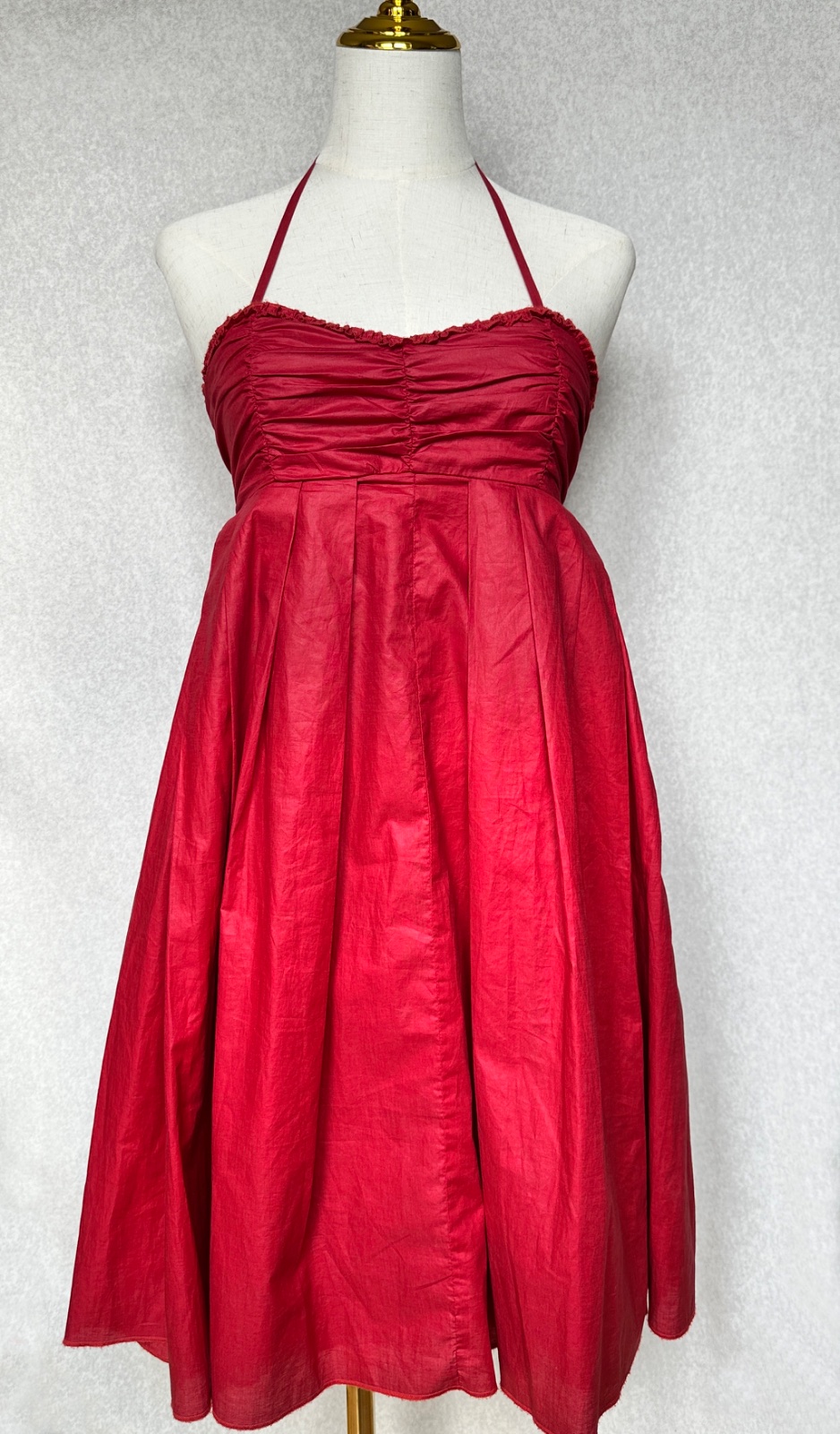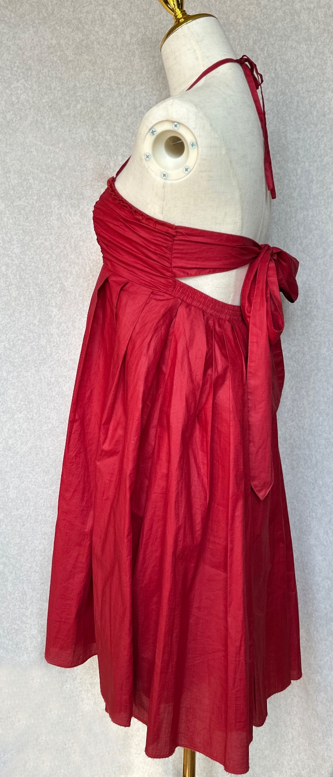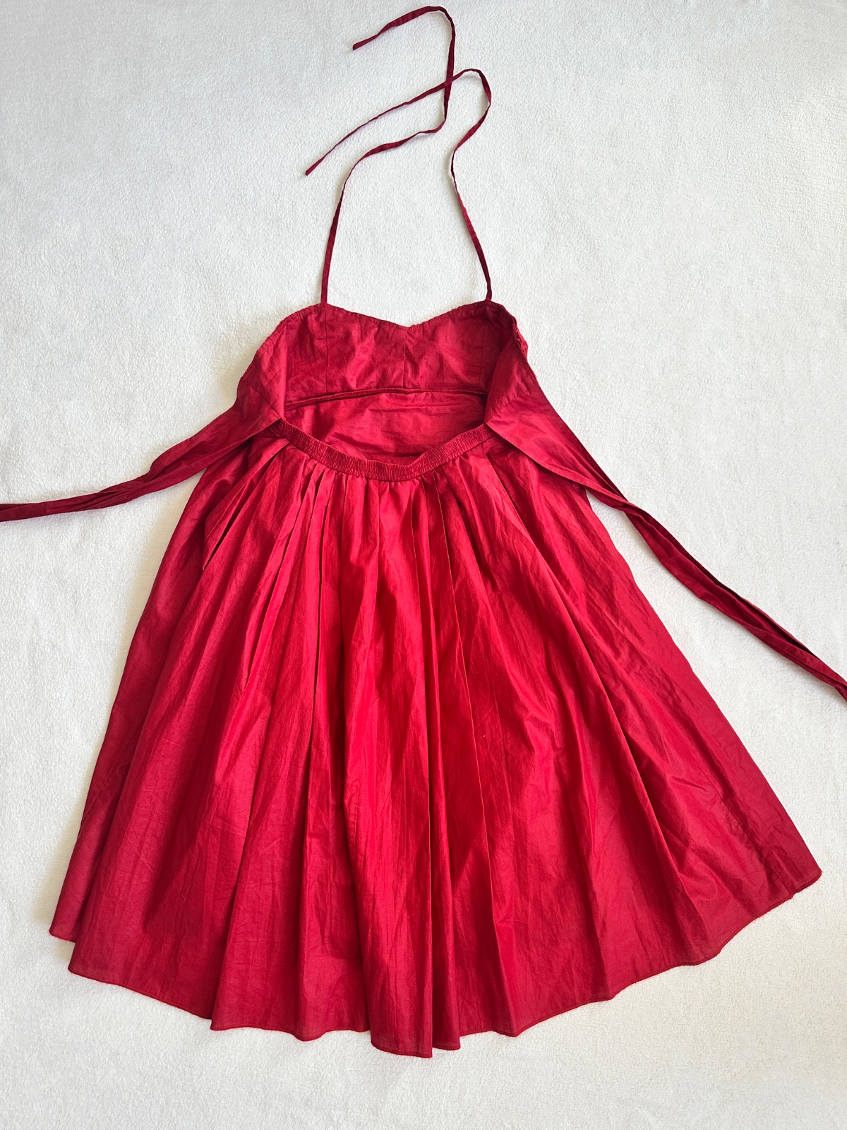 Jedinečné šaty od portugalského módneho návrhára Adolfo Domingues v sýtej tmavej červenej farbe. Látka má krásny lesk, pôsobí ako navoskovaná, ale je ultra ľahučká, vzdušná. Sú vhodné aj na príležitosť. Šité sú z dvoch vrstiev látky. Dajú sa pekne prispôsobiť na postavu - vrch sa uväzuje okolo krku na šnúrku (je tak možné nastaviť výšku, polohu) a vrchný diel sa uväzuje vzadu mašľou na chrbte - dá sa utiahnuť podľa potreby. V páse je pružná gumička.