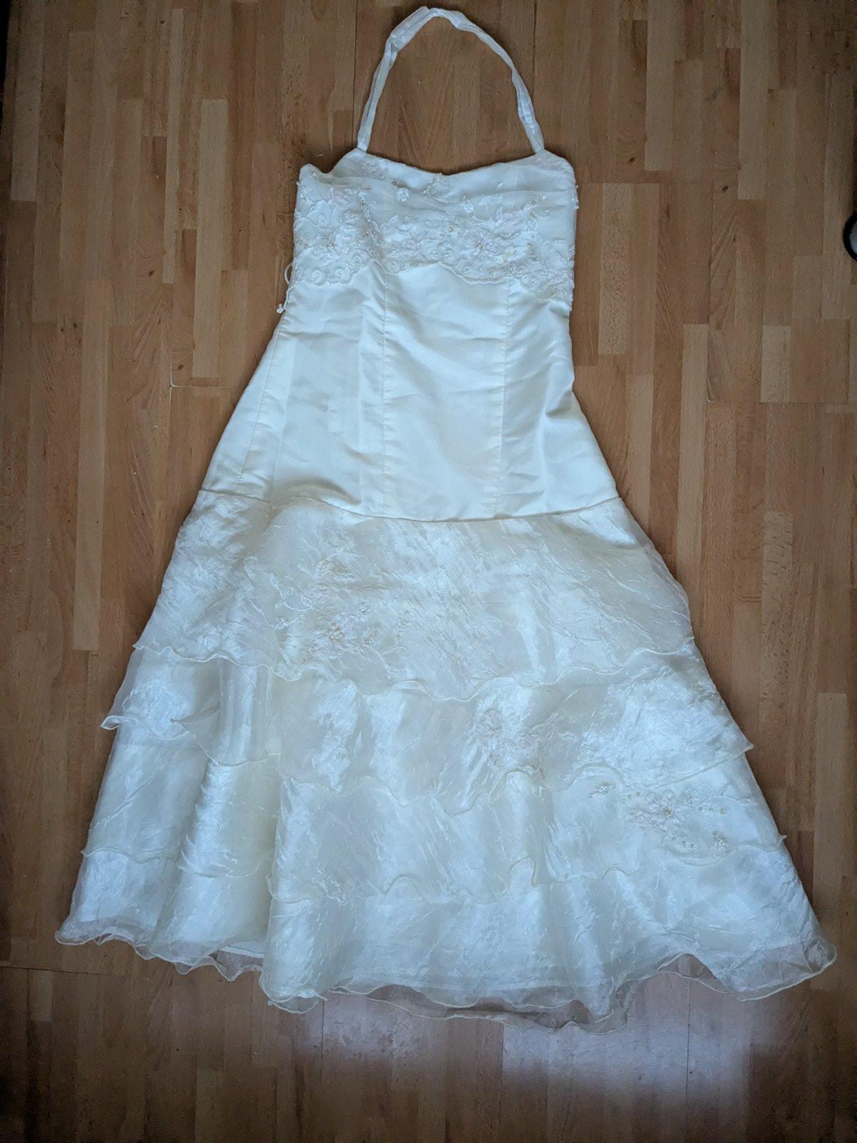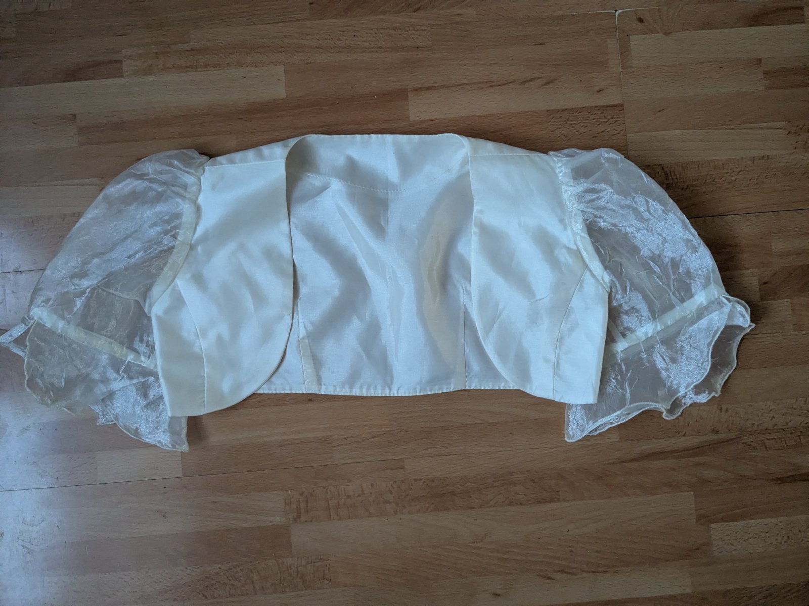 Slávnostné šaty, biele, je k nim aj bolerko. Kúpené v svadobnom salóne, boli ušité pre svadobný salón. Dcéry sa v nich hrali na princezné, dobrý stav.