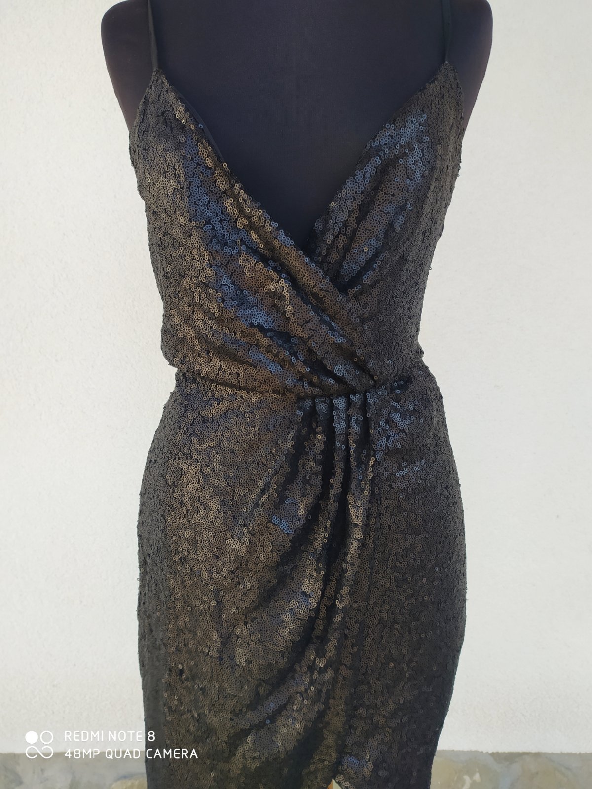 Predam raz oblecene saty XS, cierne satenove, su mini, na stihlu postavu, zdobene velkymi kamienkami, vzadu na zips, posobia velmi pekne az luxusne. Cena 4e plus posta