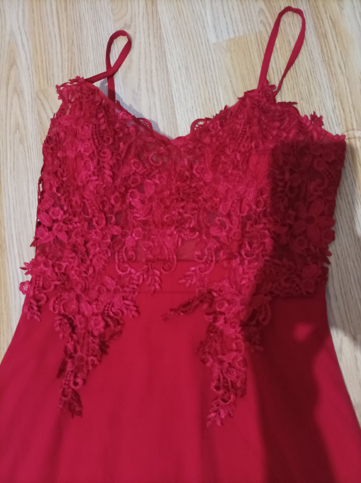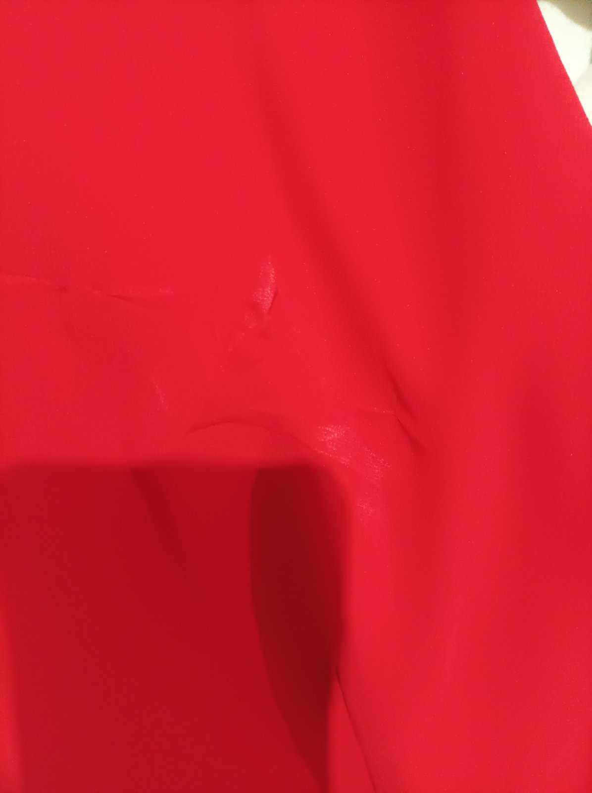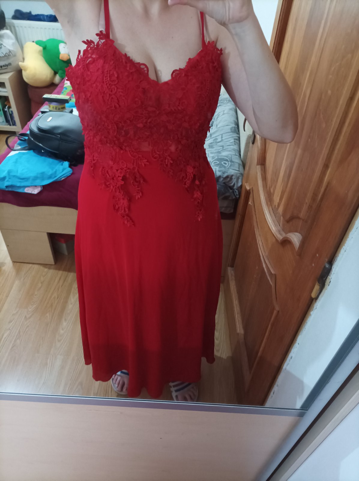 Raz oblečené šaty. V zadu na spodu sukni poškodenie. Material sukne je nieco ako tilova a bola zle ozehlena. Poskodenie odfotene aj zakružkovane. Nieje do oci bijuce. Ešte možno niekomu posluzia. Preto aj ta cena. Farba je pekná červená foťák skresloval. Natiahla som ich na seba kôli foteniu a ja som priblala na veľkosť L až Xl takže to len aby ste videli ako vyzerajú na postave.