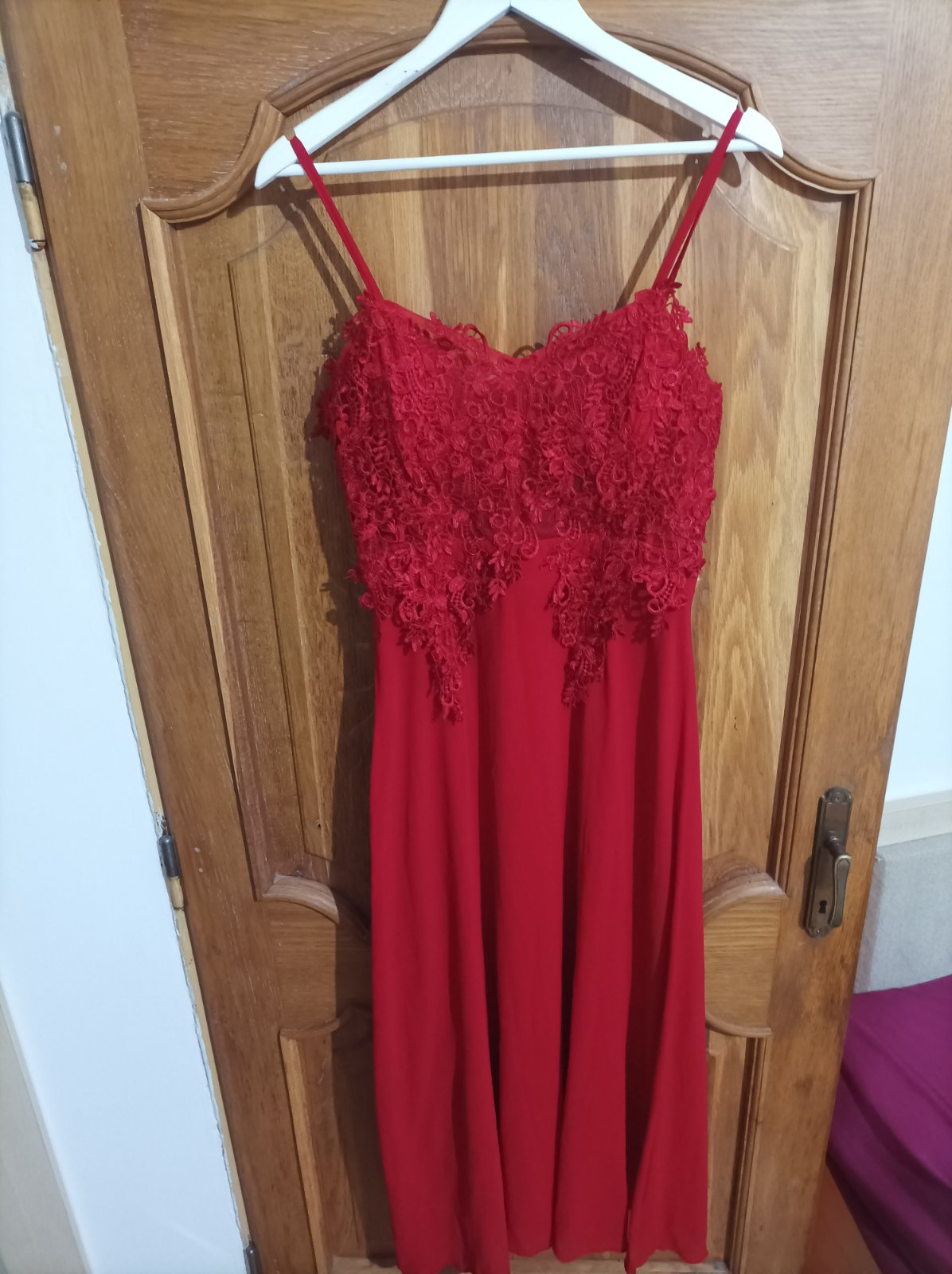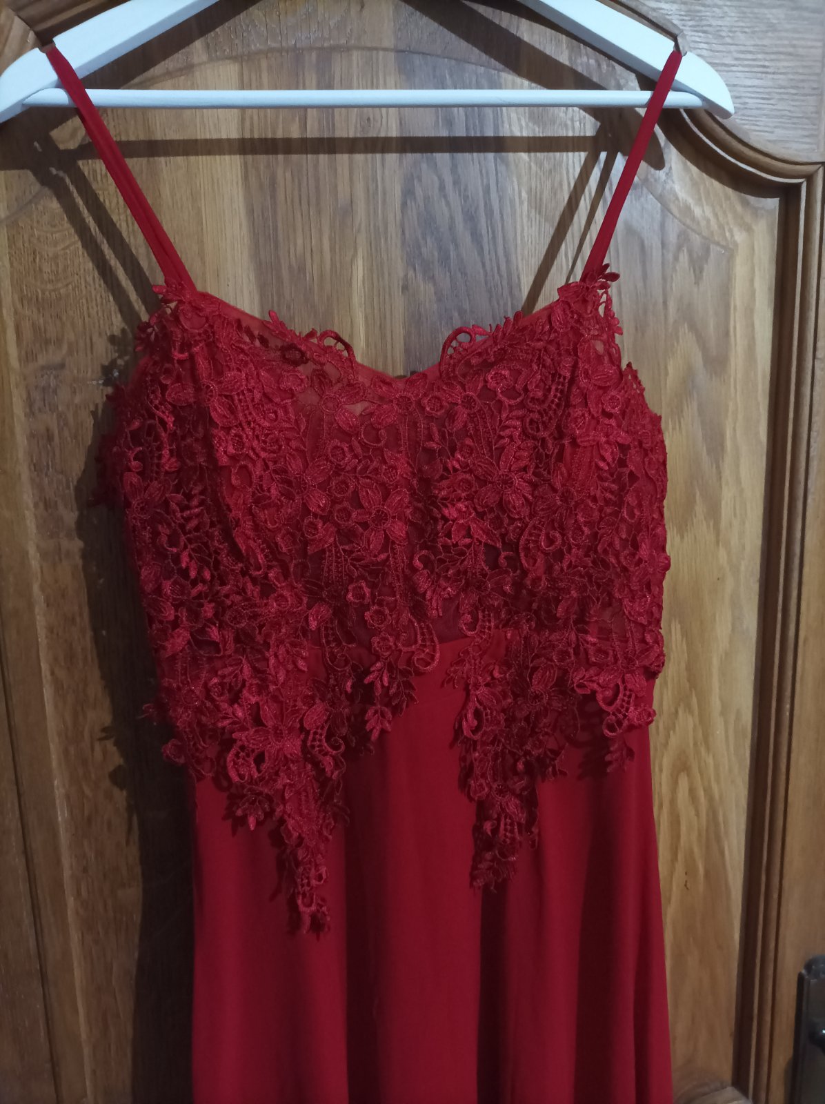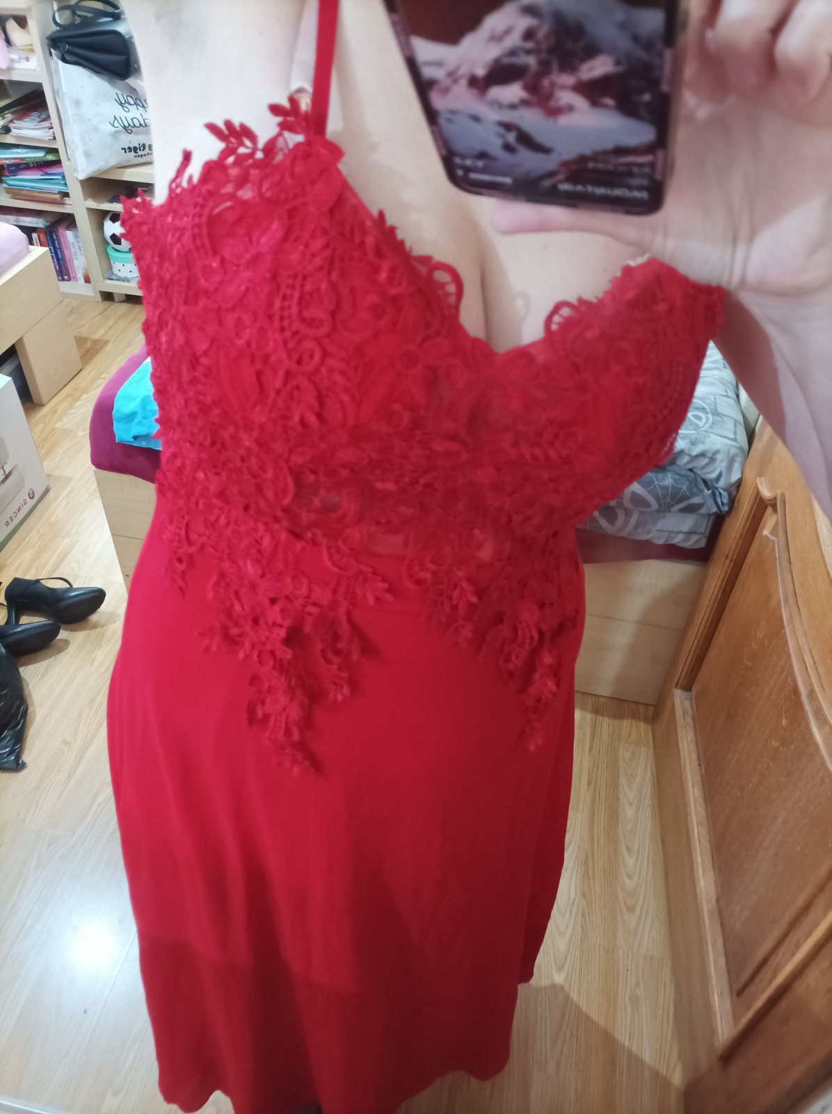 Raz oblečené šaty. V zadu na spodu sukni poškodenie. Material sukne je nieco ako tilova a bola zle ozehlena. Poskodenie odfotene aj zakružkovane. Nieje do oci bijuce. Ešte možno niekomu posluzia. Preto aj ta cena. Farba je pekná červená foťák skresloval. Natiahla som ich na seba kôli foteniu a ja som priblala na veľkosť L až Xl takže to len aby ste videli ako vyzerajú na postave.