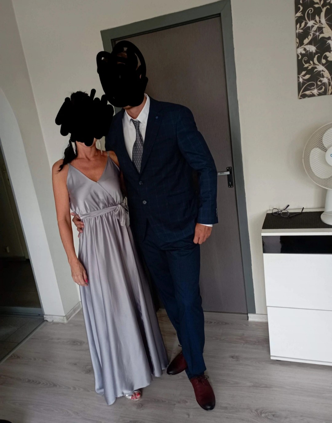 Krasne saténové šaty, farba strieborna/siva, kludne na velkost xs,s,. Maju razporok. Super stav. Nastaviteľne ramienka