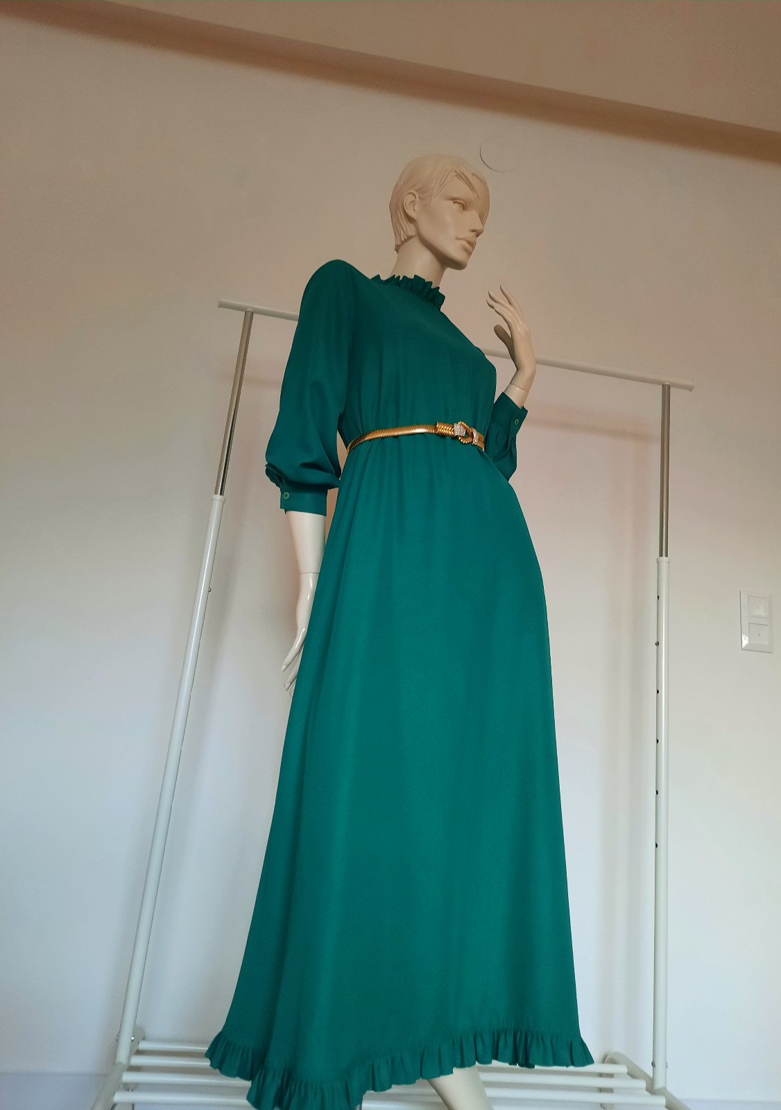 Krásne Kvetová šaty v kombinácii so smaragdovou zelenou formujú postavu,kúpené v butiku