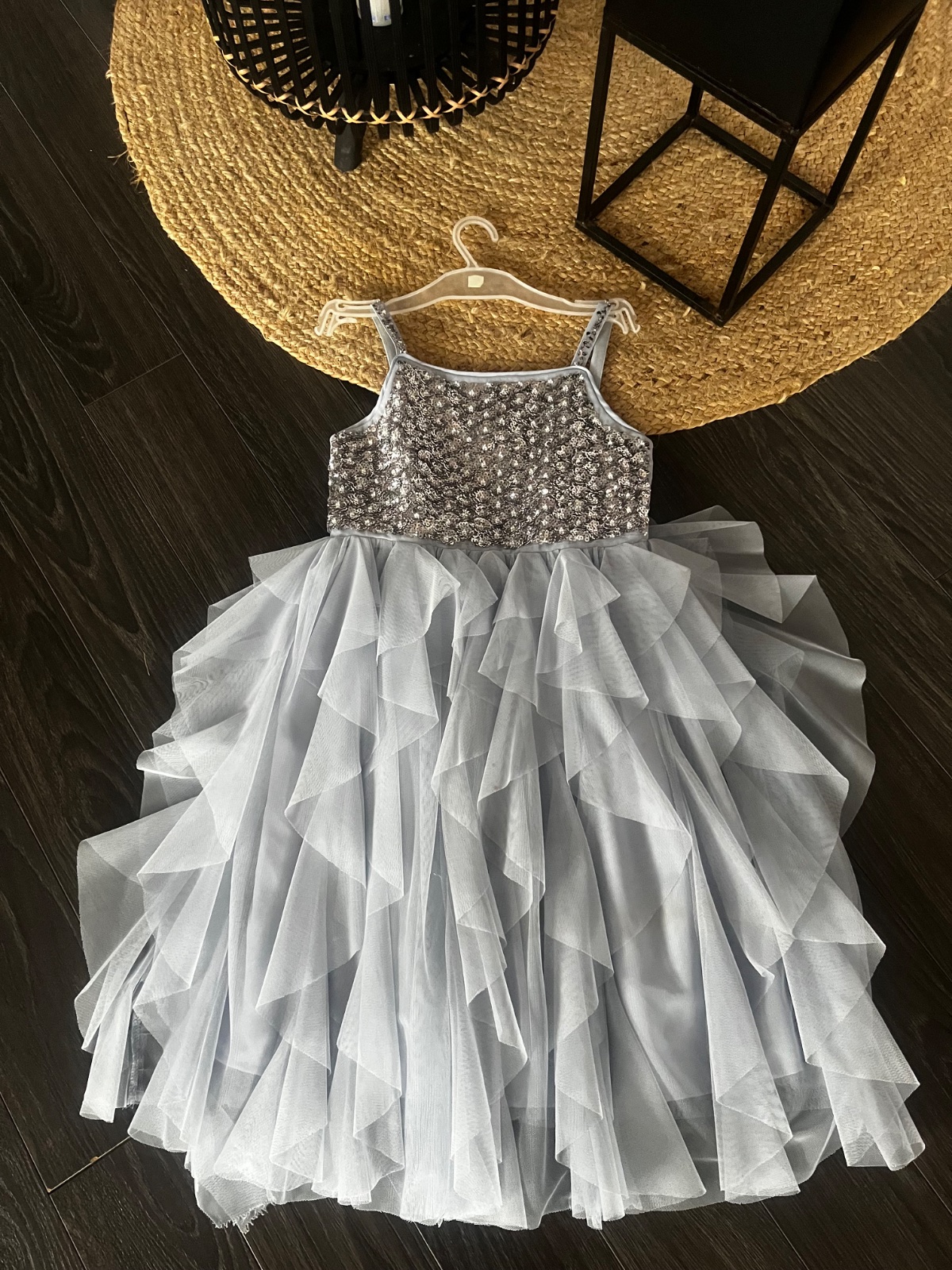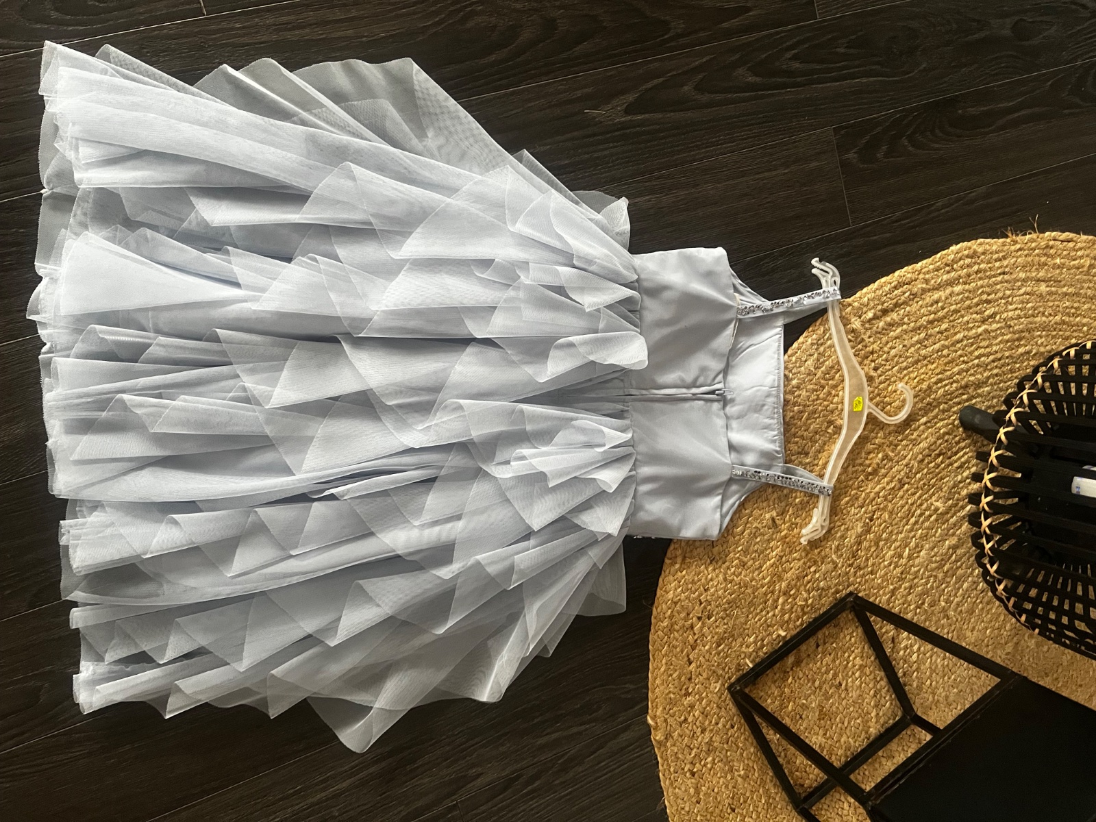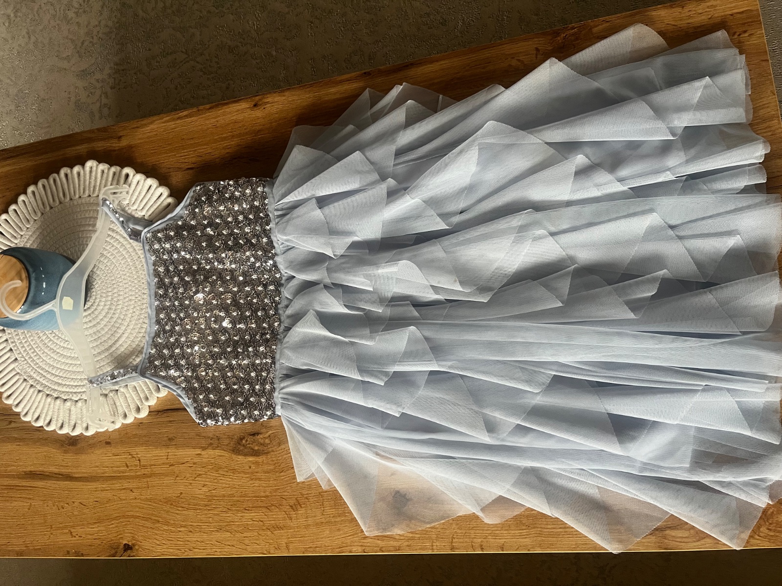 Predam krasne, lahucke saty, od H&M, velkost pisana 8-9, aj zodpovedaju. Vyborny stav, nemaju ziadne poskodenia. Saty su malo nosene, nakolko sme mali toho vela. Farba je taka sedo-bledomodra.