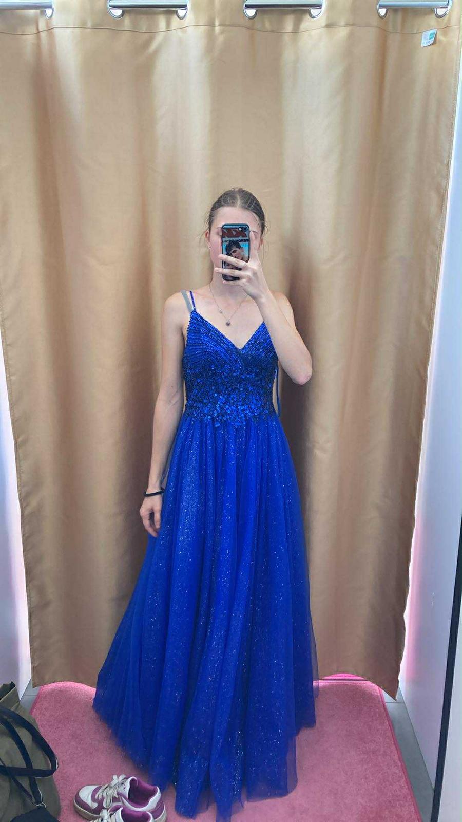 Krásne šaty v parížskej modrej farbe veľ. píše M alebo veľ.38 príjemný materiál s jemnými trblietkami ktoré sa trblietajú na svetle, na slnku... krásne ukážu na postave a schovajú aj menšie bruško...