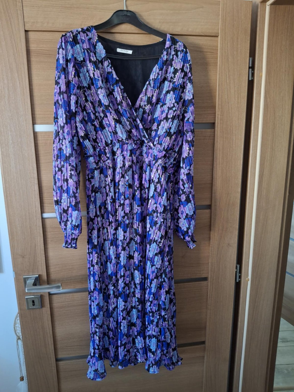 Kvalitné saténové šaty fialovej farby s potlačou, materiál 95% polyester, 5% elastan, super stav. šírka v podpazuší 48x2 cm, pás 39x2 cm, boky aj 70x2 cm, dl. 95 cm,v 18/20/42 ZNAčKA: ORSAY VEĽK...