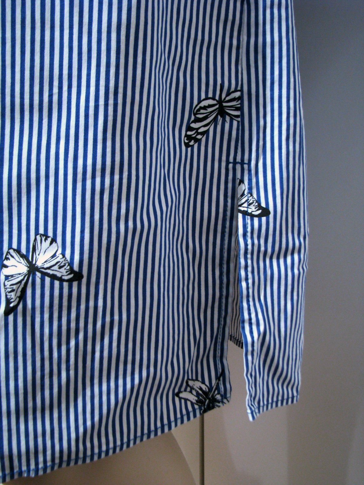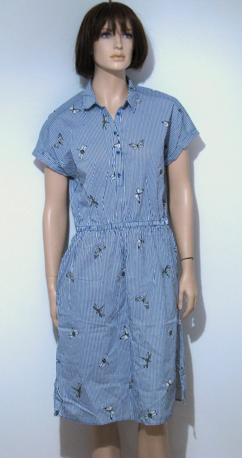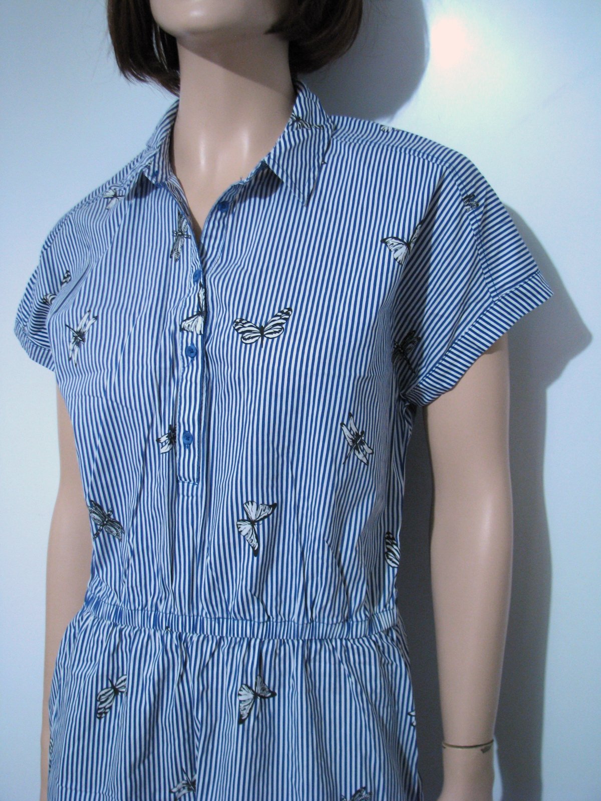 Krásne pohodlné letné šaty košeľového strihu so vzorom jemných prúžkov a hmyzu - motýle a vážky. Farba biela + stredne modrá + čierna. V páse guma, na bokoch vrecká. Nemajú žiadne poškodenia. Štítok s materiálom chýba, odhadujem bavlnu alebo viskózu s elastanom, nakoľko sú aj trochu elastické. Veľkosť píše M, no isto sadnú aj na L. V prípade záujmu premeriam.