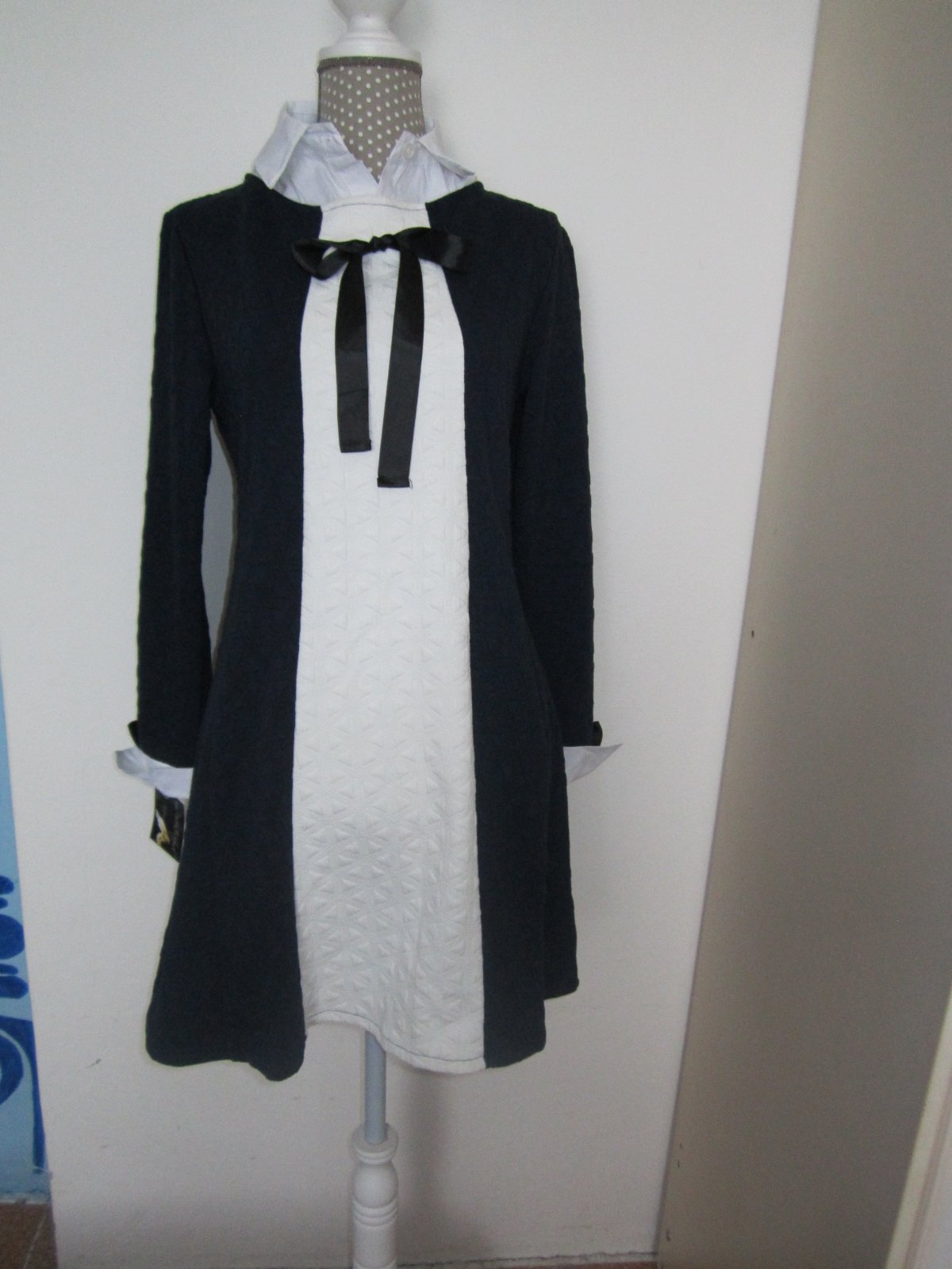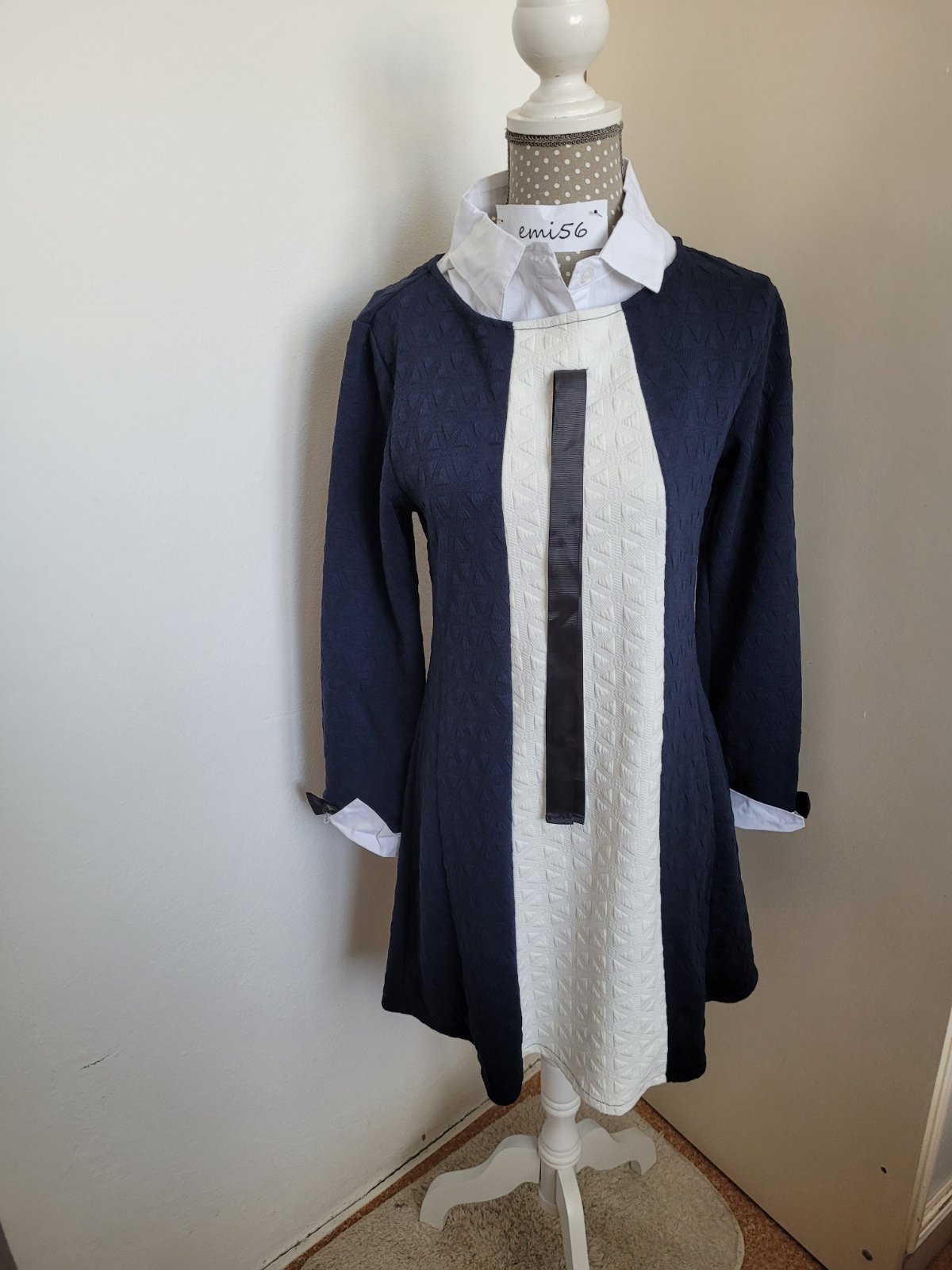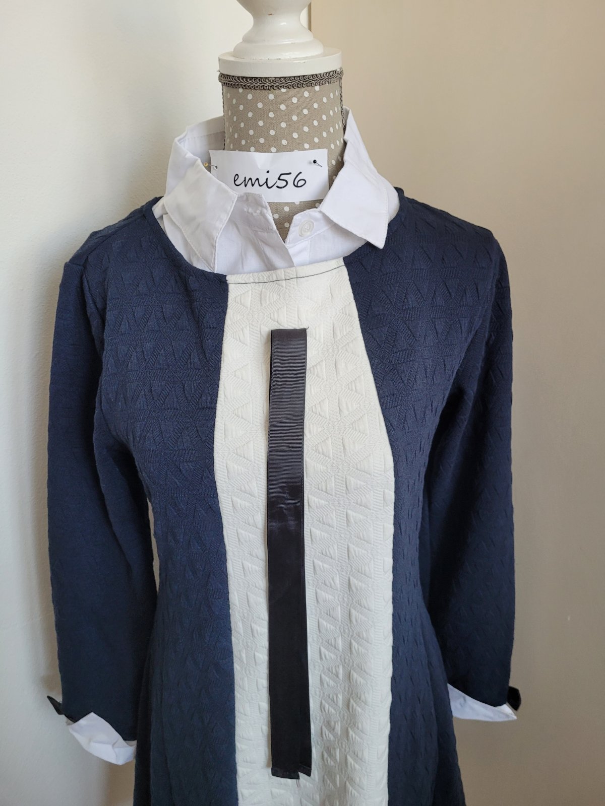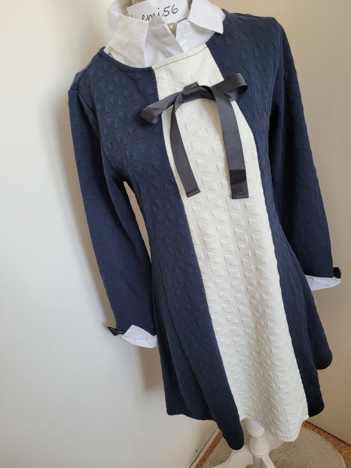Elegantna, moderna, podľa poslednej módy tm. modrej farby s bielou kombinovaná. Ako nenosená, nevšedná, objed. z internetu. Strih do „A“. Dlhé rukávy sú zdobené s bielymi manžetami a mašličkou. Výstrih okrúhly, s odoberateľnou časťou, ktorá pôsobí ako košeľa. Moderný kus Vášho oblečenia.