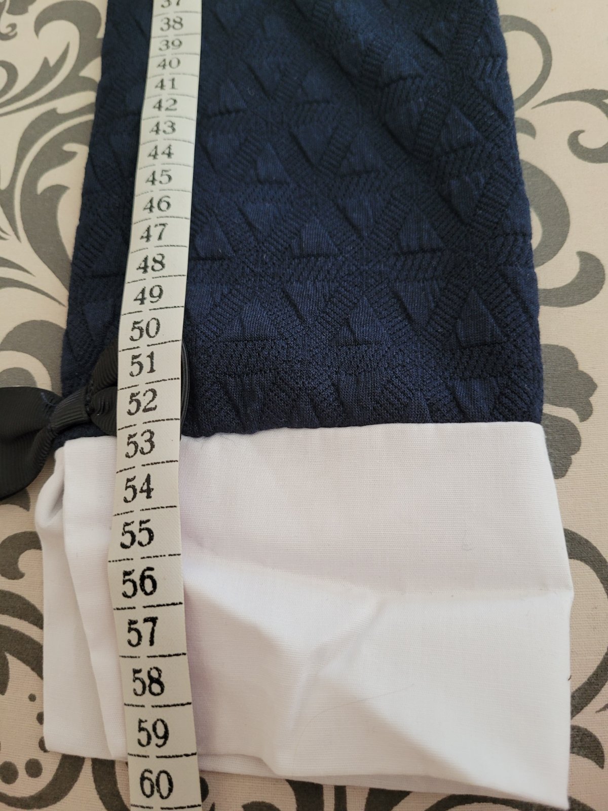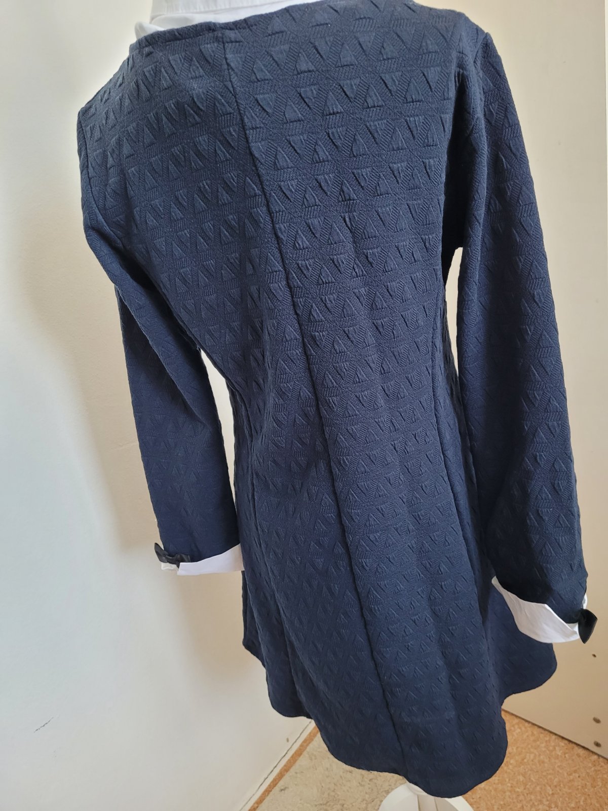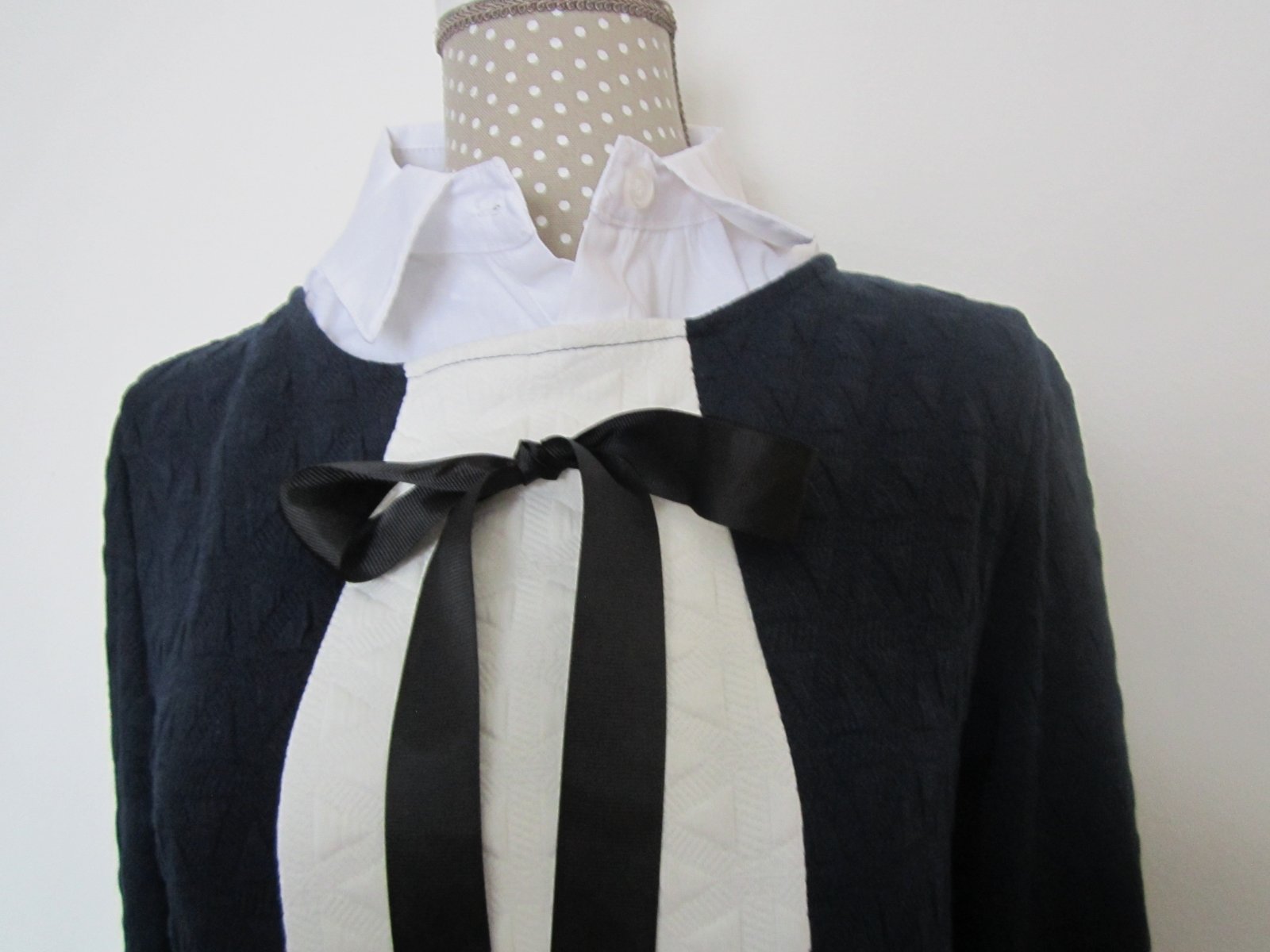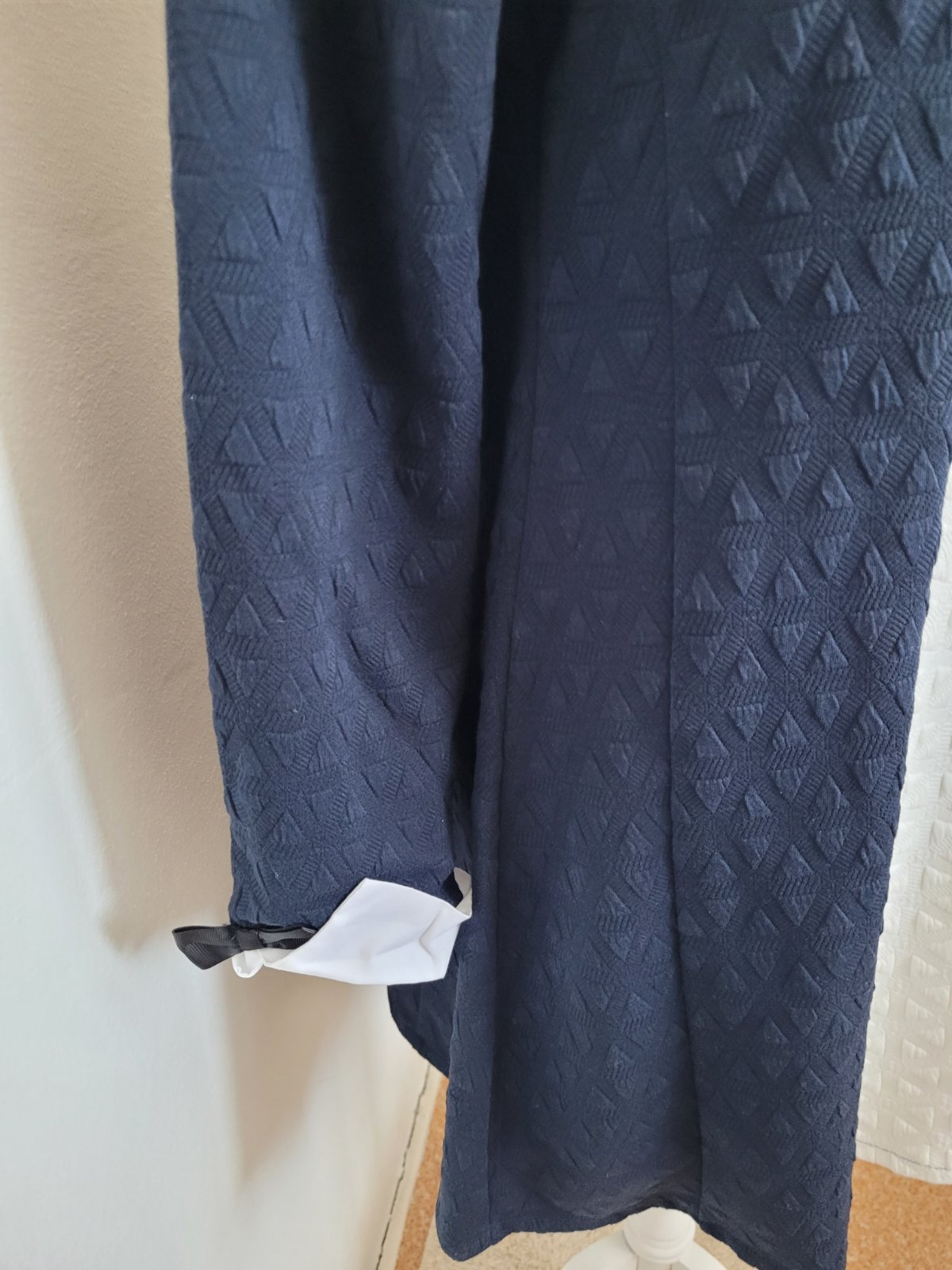 Elegantna, moderna, podľa poslednej módy tm. modrej farby s bielou kombinovaná. Ako nenosená, nevšedná, objed. z internetu. Strih do „A“. Dlhé rukávy sú zdobené s bielymi manžetami a mašličkou. Výstrih okrúhly, s odoberateľnou časťou, ktorá pôsobí ako košeľa. Moderný kus Vášho oblečenia.