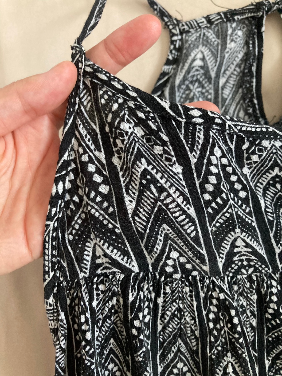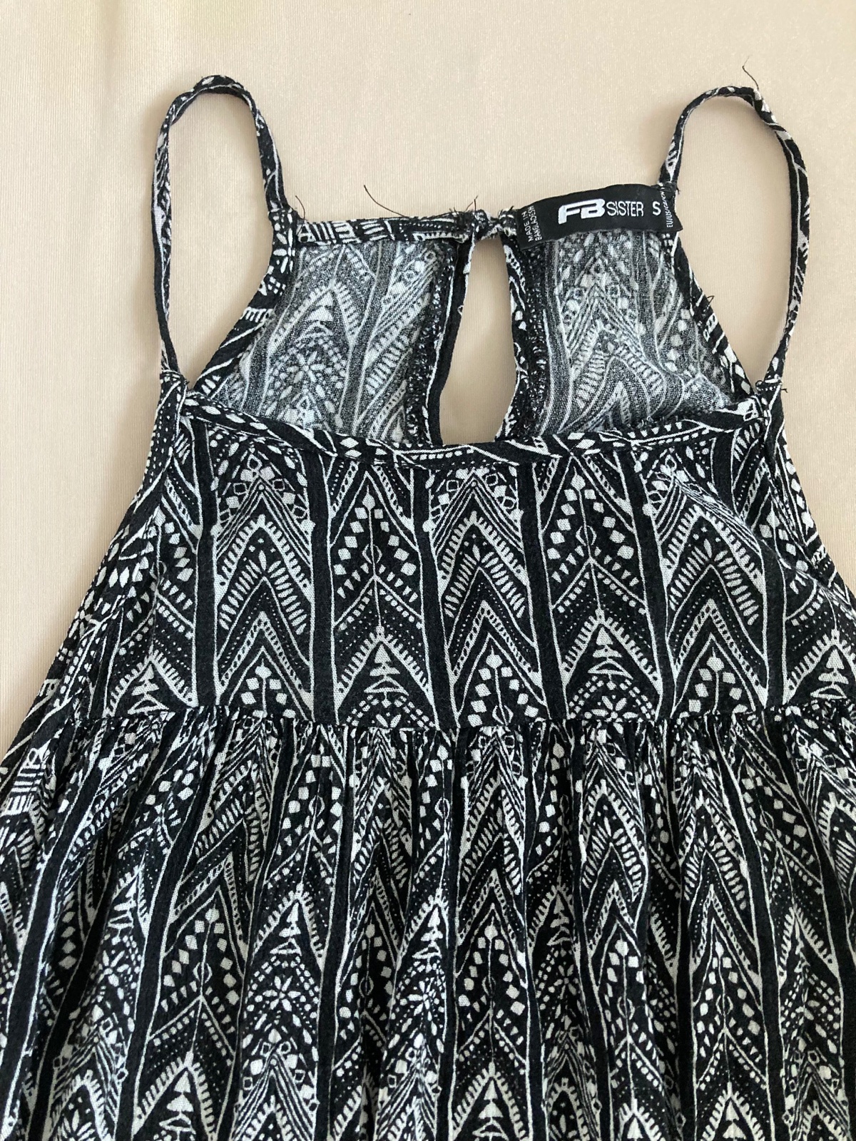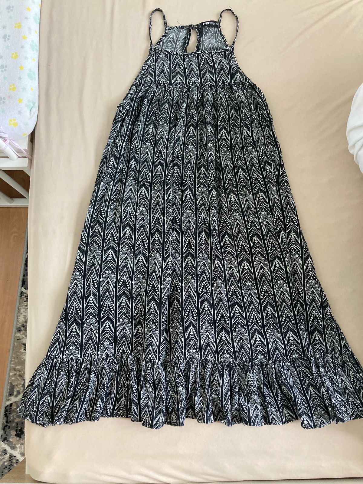 Krasne saty, zapinanie za krkom, nekrcivy vzdusny material, mozne je nosit ich aj s opaskom, zial ho uz neviem najst, maju krasny vzor, velkost oblecie xs aj s postava.