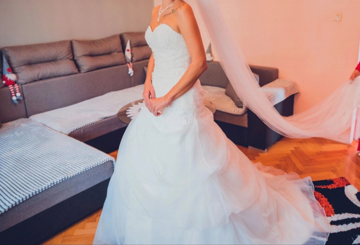 Predam svadobne šaty aj so zavojom velkost 36. Šaty sú vyčistené ako nové pripravené pre novú nevestu. Ak by bol záujem mám aj biele topánky ktoré som nakoniec ani nemala čiže sú úplne nové veľkosť...