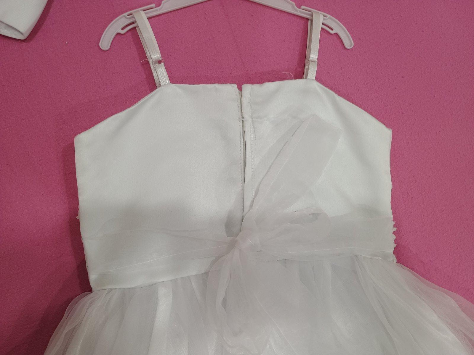 Predám použité šaty buď na svadbu ako družička alebo na 1 sv.prijímanie. Šaty sú na nastaviť. ramienka plus bolerko majú viac spodničiek,na prednej časti boli prilepené malé biele kvietky ale dcéra ich obtrhala čiže sa dajú prilepiť nove.Chýba im bežec(šikovná mamina kúpi a vloží)preto tá cena