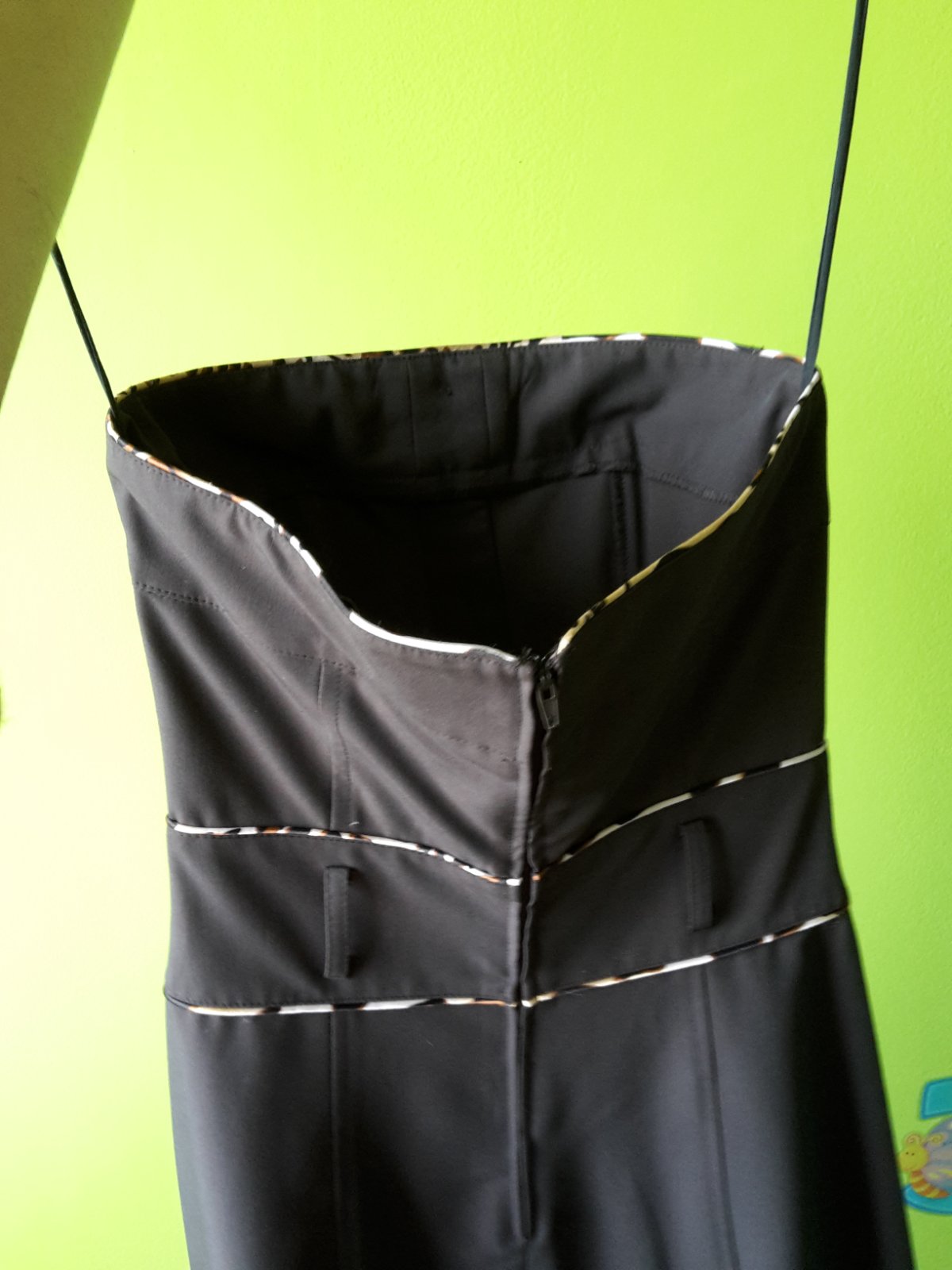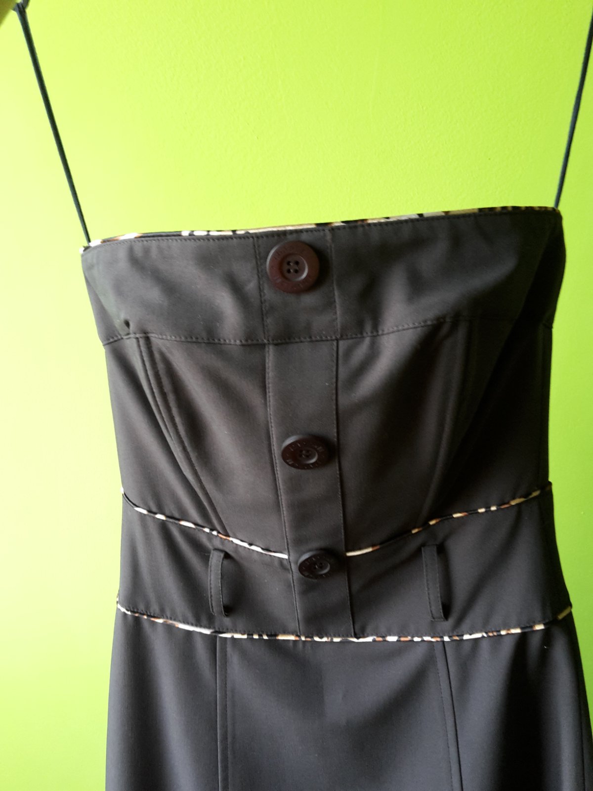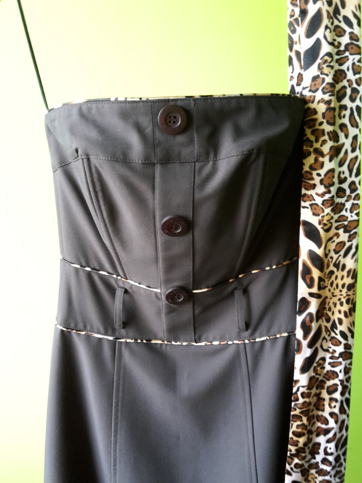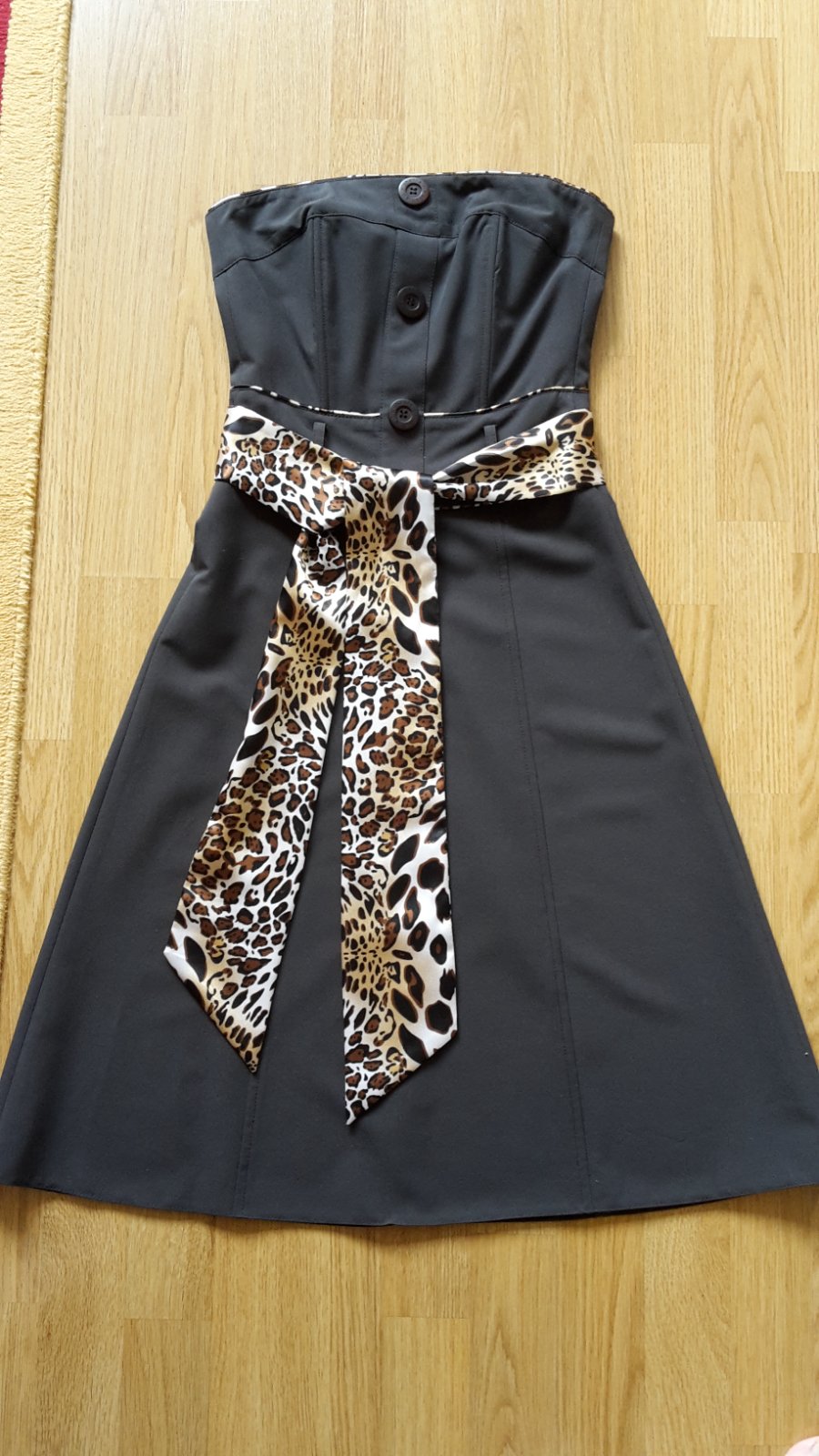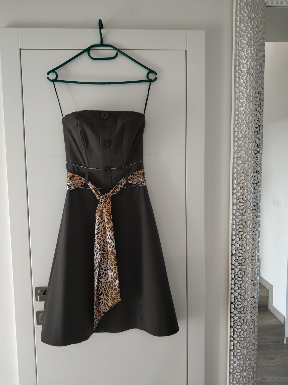 Hnedej farby bez ramienok. Strih do A. Vzadu zips. Tigrovany opasok sa da vymenit za akykolvek iny, nie je napevno. Vhodne ako spolocenske aj na bezne nosenie. Velkost 34. Kupovane v CHantall.