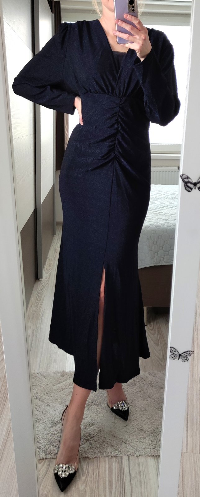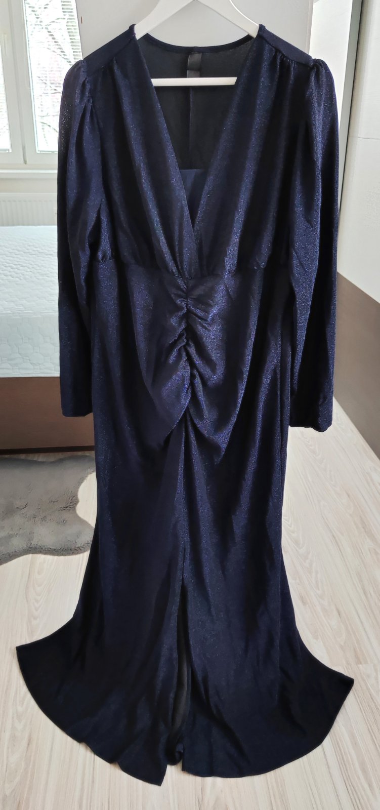 Krásne trblietavé šaty vo veľkosti 3XL, je to skôr 2XL/3XL, prikladám miery: prsia šírka 50-61, pás šírka 46-55, boky šírka 55-65, dĺžka 147, rukáv dĺžka 65. Cena 32 eur.