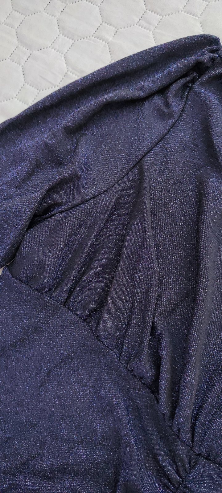 Šaty kúpené 21.11.2025. oblečené len raz na plese. Super materiál, velmi pohodlne. Maju na sebe metalicky vzor ktorý sa krásne trblieta. 3XL- prsia 100-120 cm, pás 90-105 cm, boky 140 cm, dĺžka 140 cm