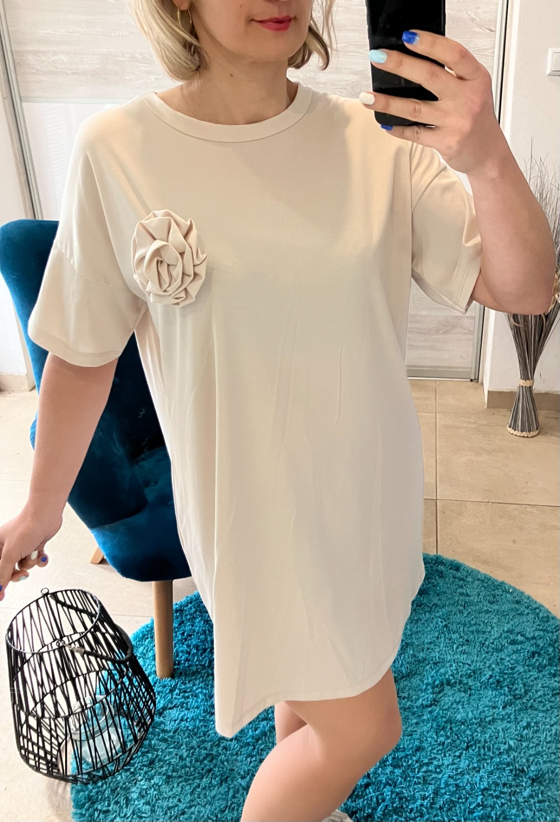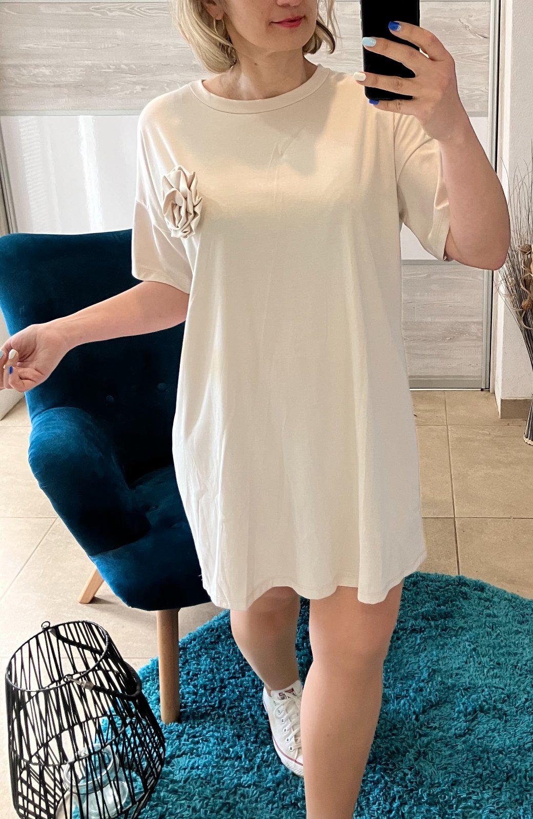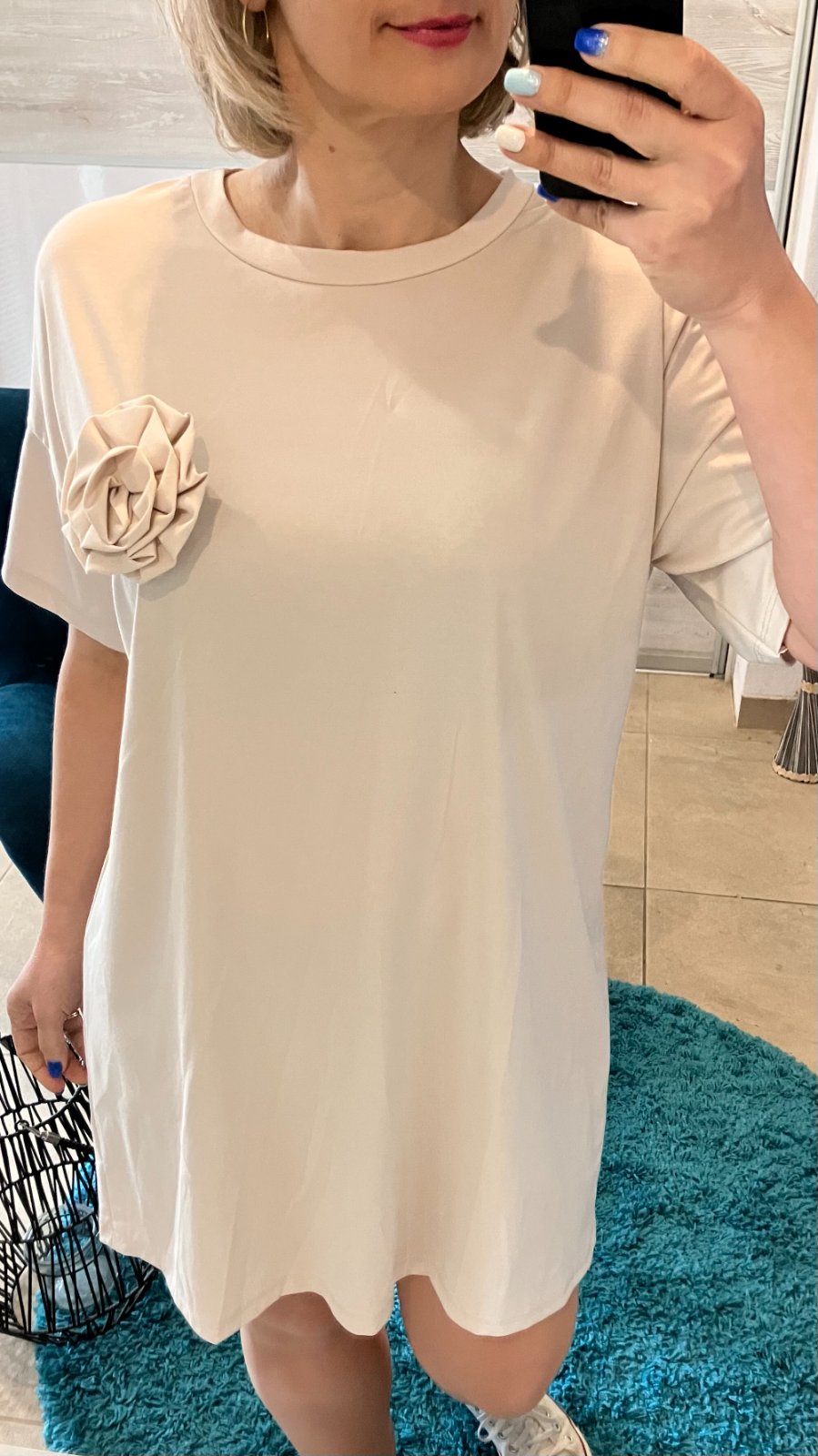 SkladomDámske oversize šaty s tričkovým strihom s krátkym rukávom a dekoratívnym kvetom, brošňou. Majú okrúhly výstrih. Elastické. Tenké. Materiál:66%viskóza,28%polyamid,6%elastan. Veľkosť UNI (vhodná pre S,M,L). Krajina pôvodu: Taliansko.