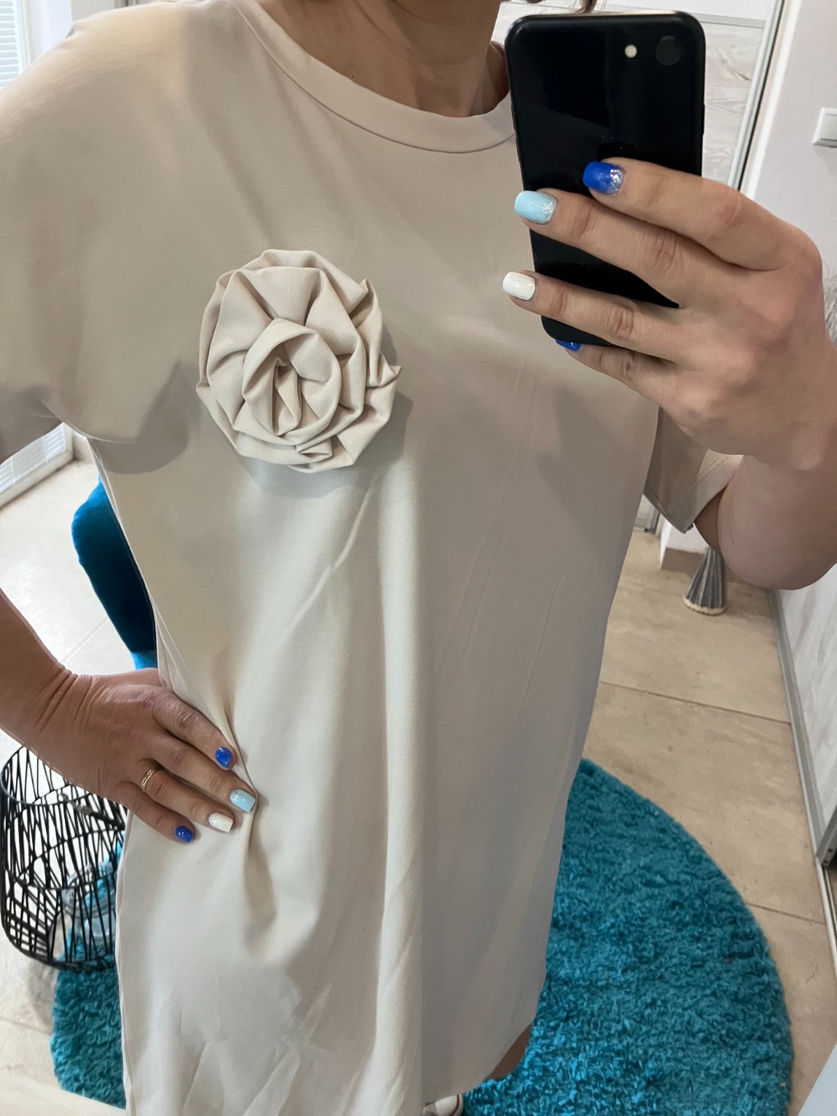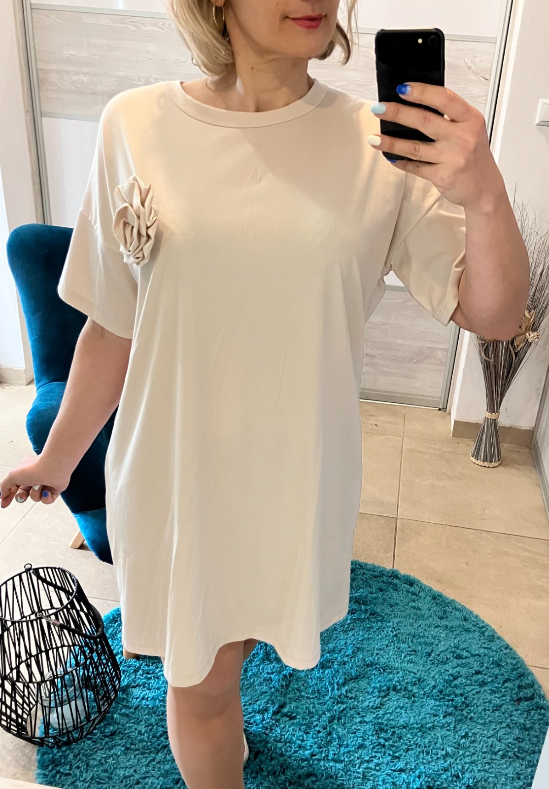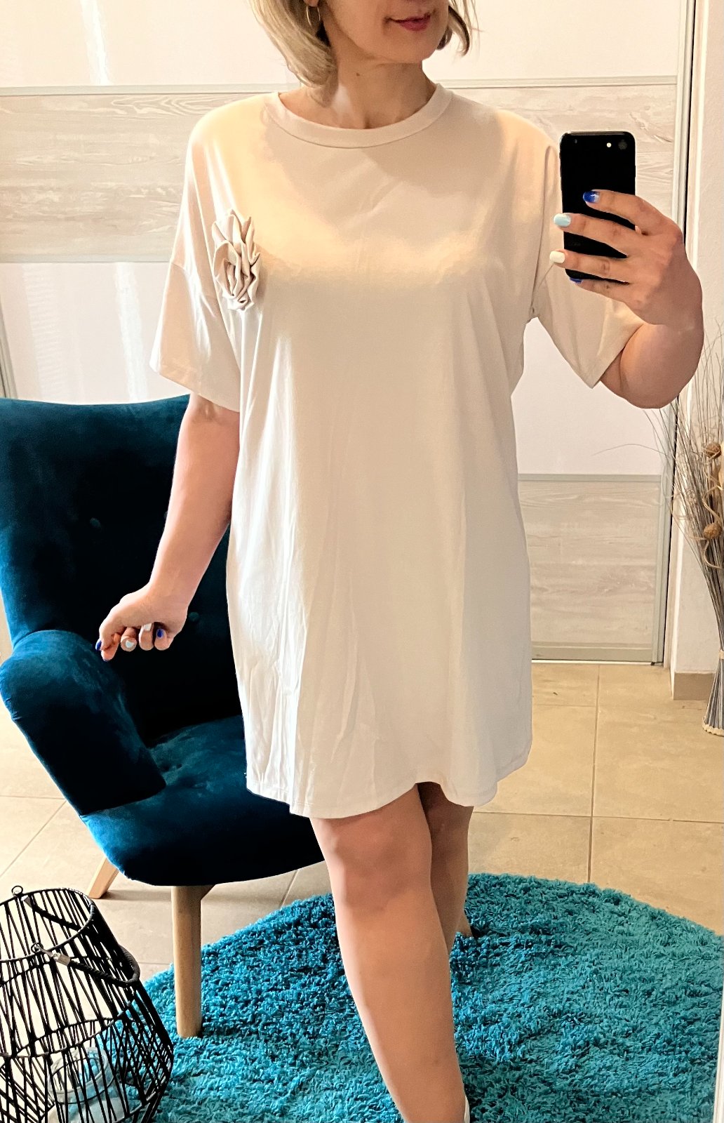 SkladomDámske oversize šaty s tričkovým strihom s krátkym rukávom a dekoratívnym kvetom, brošňou. Majú okrúhly výstrih. Elastické. Tenké. Materiál:66%viskóza,28%polyamid,6%elastan. Veľkosť UNI (vhodná pre S,M,L). Krajina pôvodu: Taliansko.