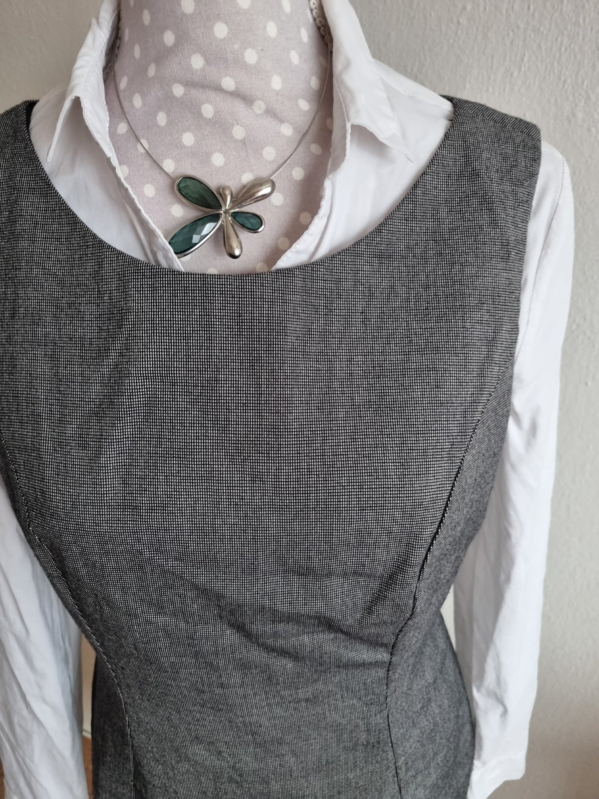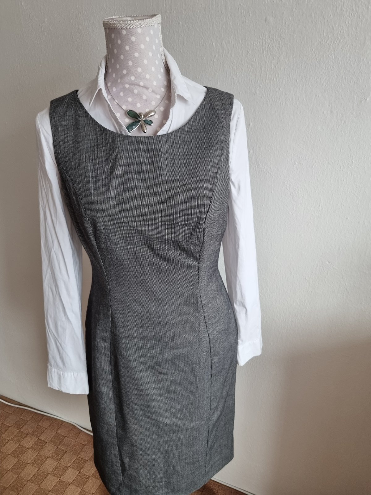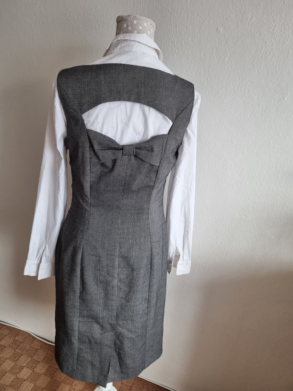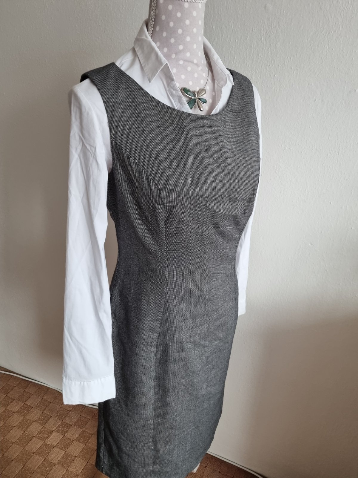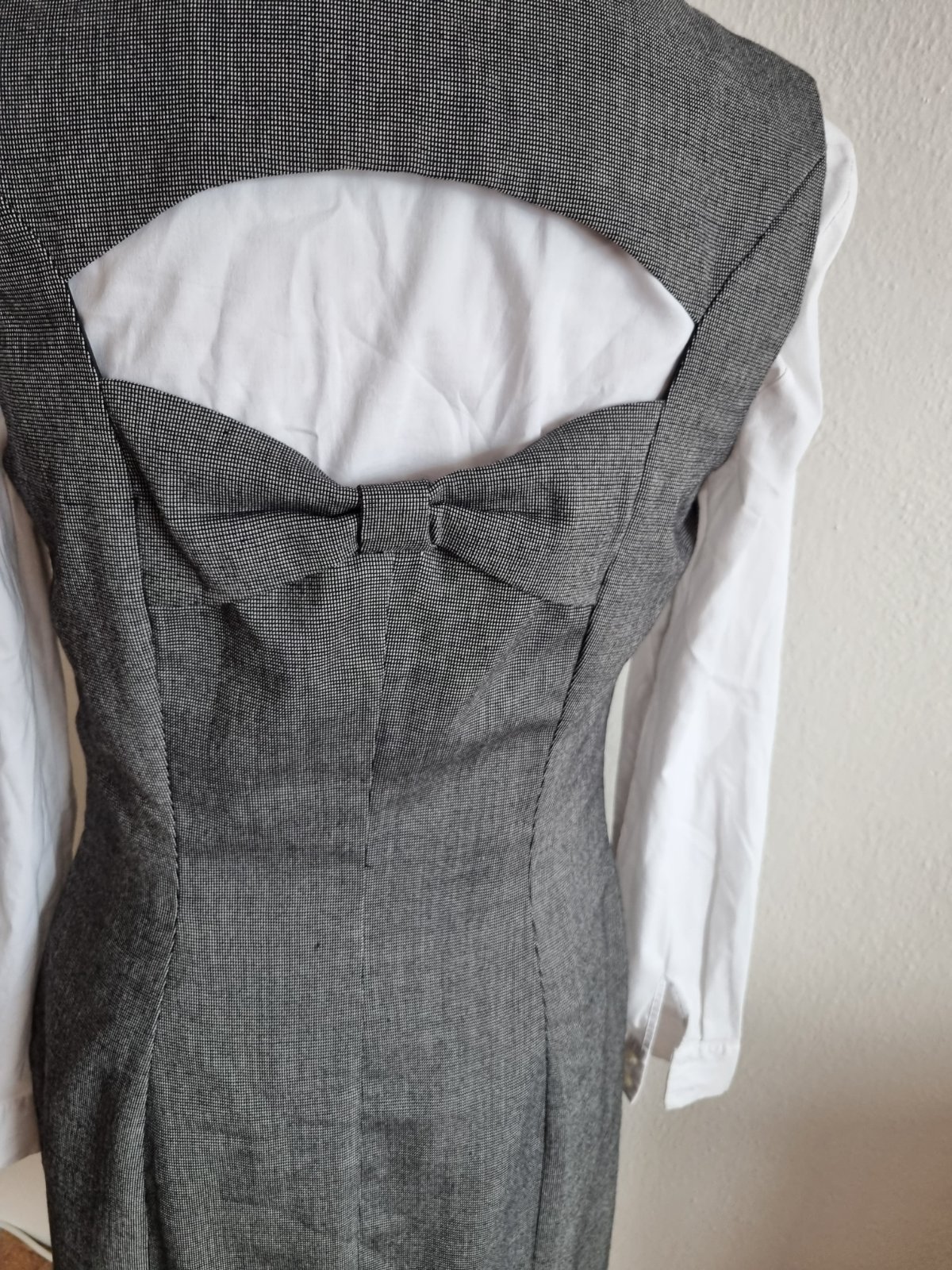 sivo čierne prskané šaty George, ozdobný otvor vzadu, pod pazuchou zips, podšité, mierne elastické, pekne sú solo so sakom, či svetrom....alebo podoblečené blúzkou, košeľou, dlžka 100, prsia 48x2, pás 40x2, boky 49x2