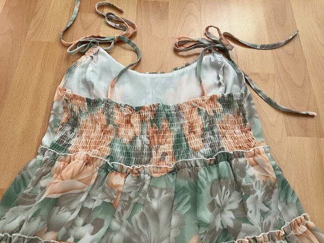 TRIEDIM SATNIK, vela veci nevynosime, tak posuvam dalej za symbolicke ceny. Letne zeleno-oranzove saty, s viazanim na ramenach. Vzadu na gumicku, takze sa prisposobia obvodu prs. Velkost S, celkova dlzka 66,5 cm. Zapinanie je zboku na neviditelny zips.
