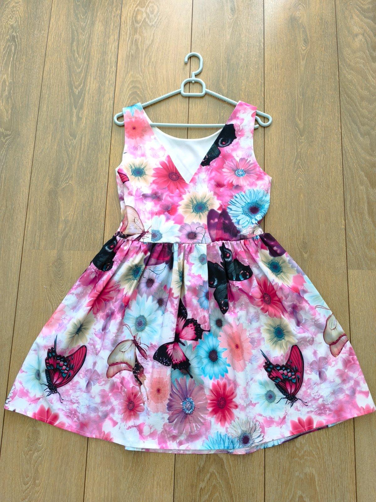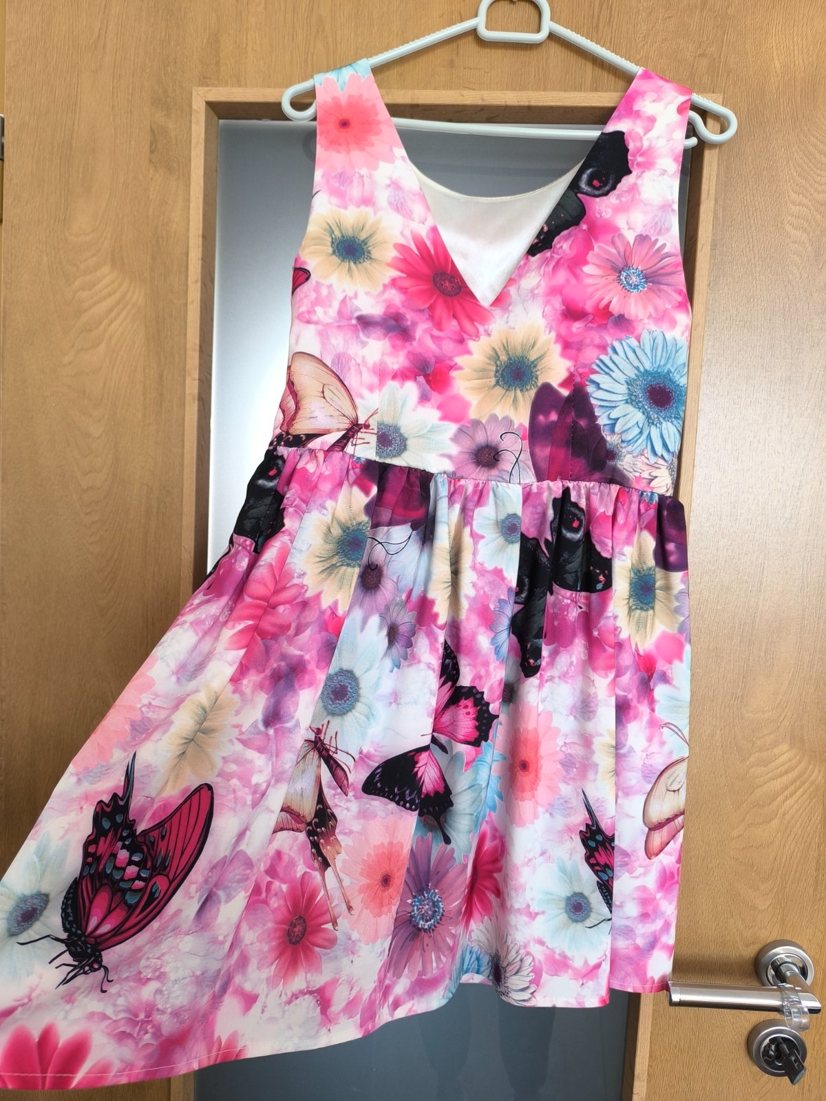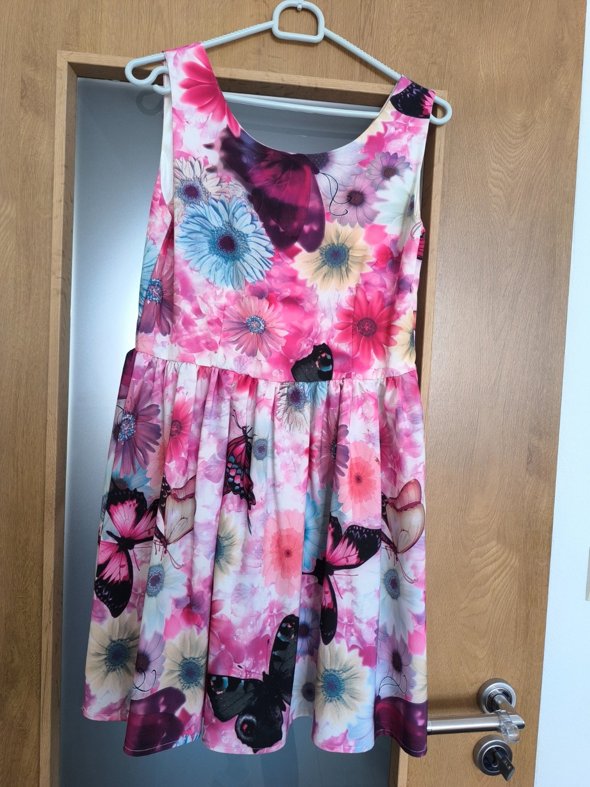 Ružové šaty, bez rukávov. Veľkosť sadne aj na S. Ľahké, letné.